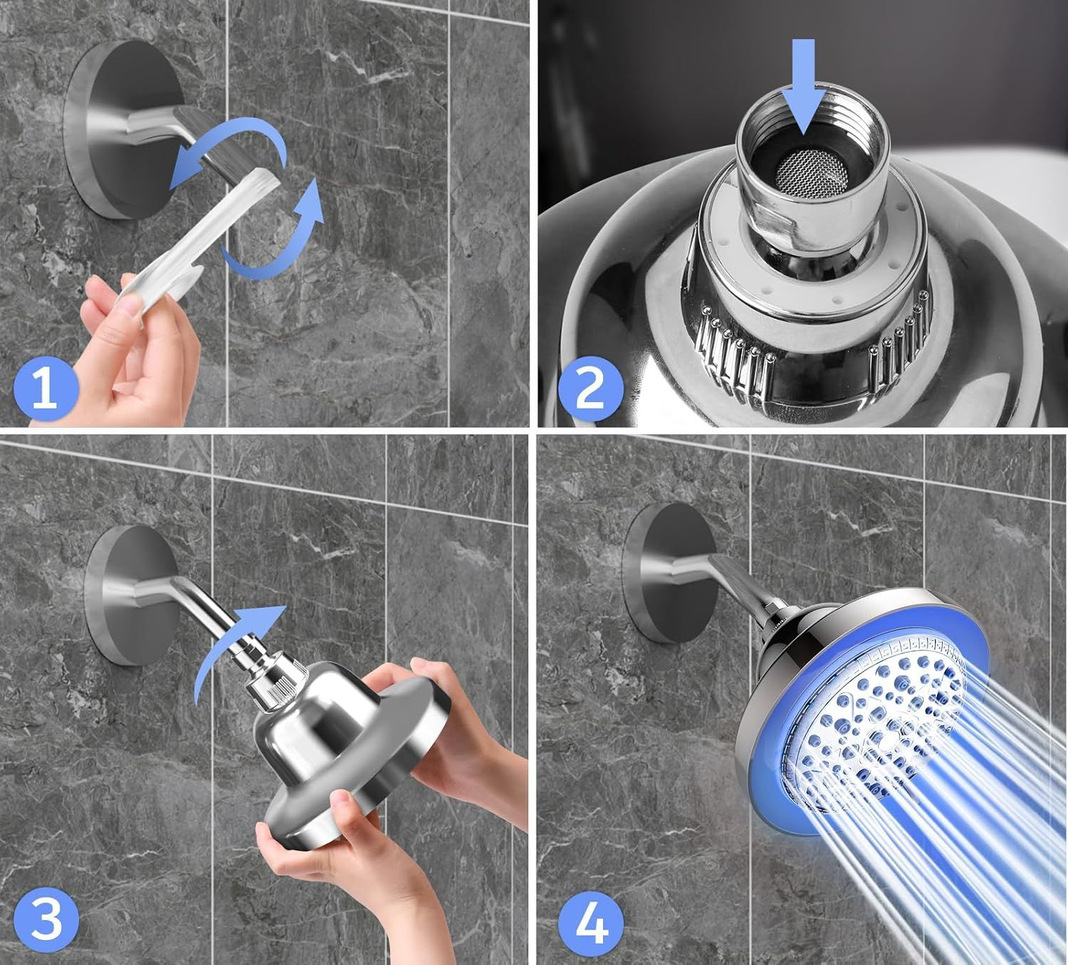 • Acest cap de duș cu LED-uri FEELSO este echipat cu un strat puternic de filtrare, cu KDF superior, sulfit de calciu, bile alcaline de acid methacioic și așa mai departe, are ca scop îndepărtarea clorului rezidual, a metalelor grele (plumb, mercur, nichel, crom) și a altor substanțe nocive.