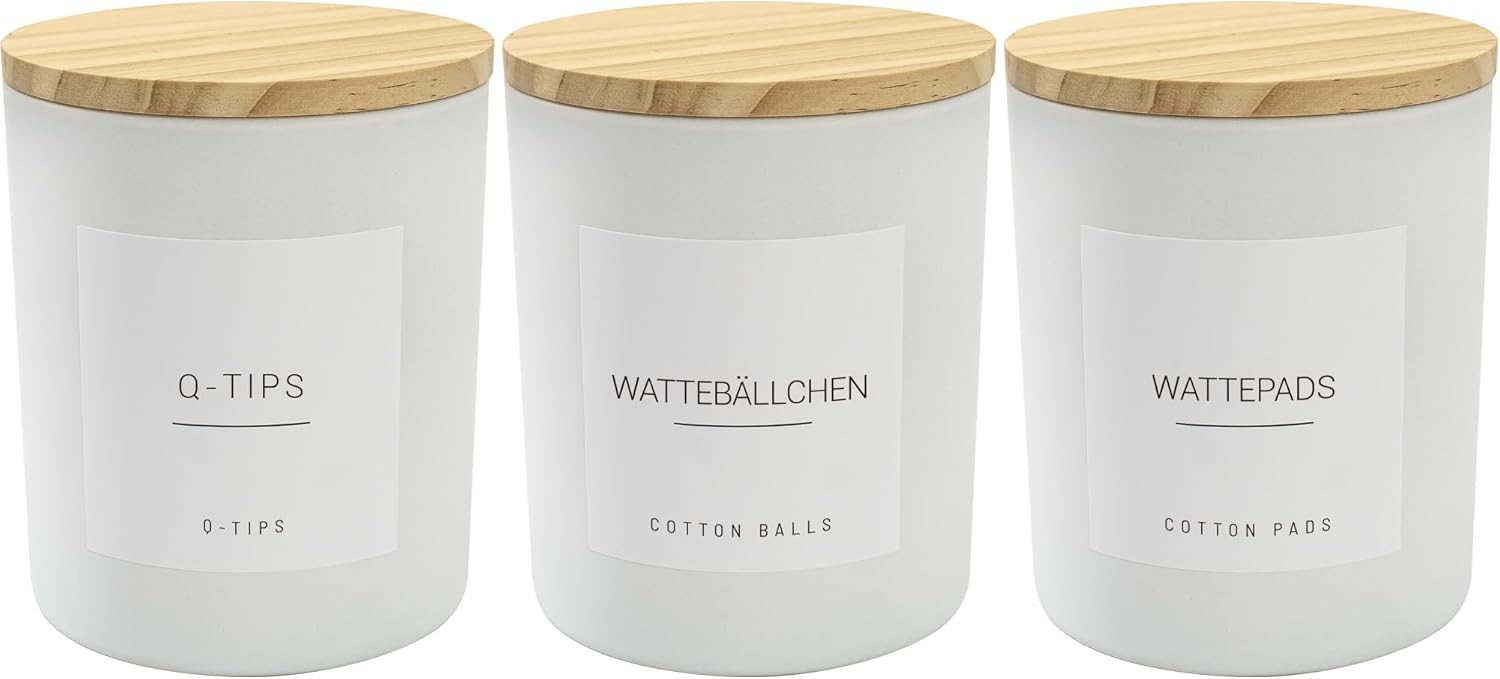 Pachetul include 3 recipiente de sticlă cu capace etanșe din lemn pentru decorarea băii și 12 etichete impermeabile albe pre-imprimate. Dozator de suport Qtip de 13.5 oz Qtip este potrivit pentru tampoane de bumbac, vârfuri Q, bile de bumbac, tampoane de bumbac și bastoane de ață dentară.
