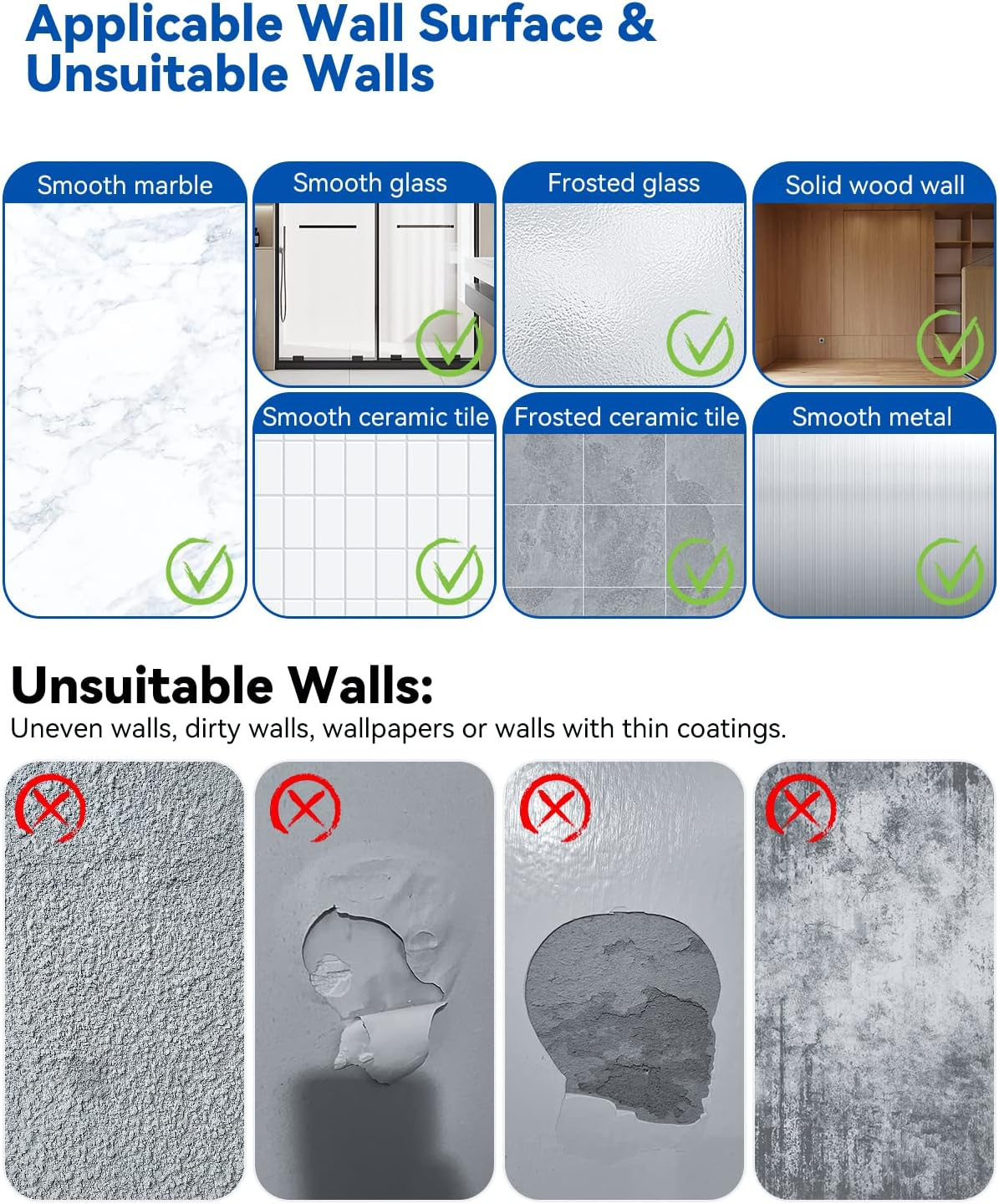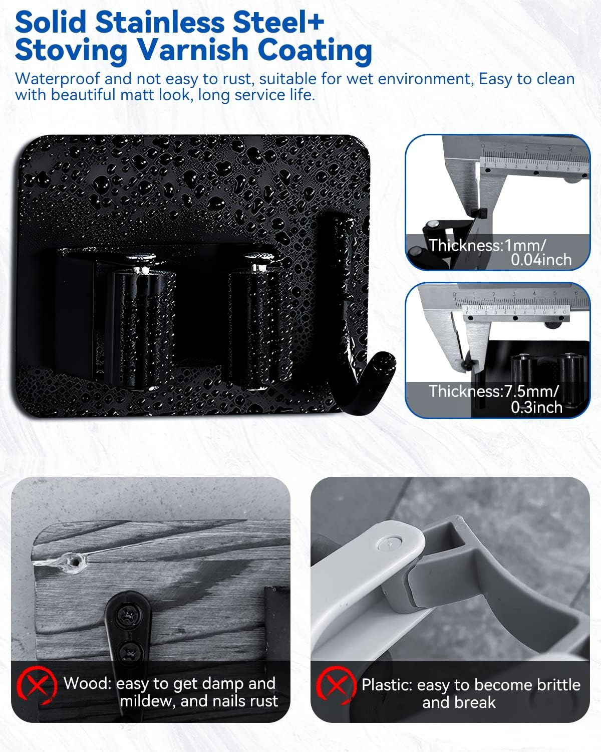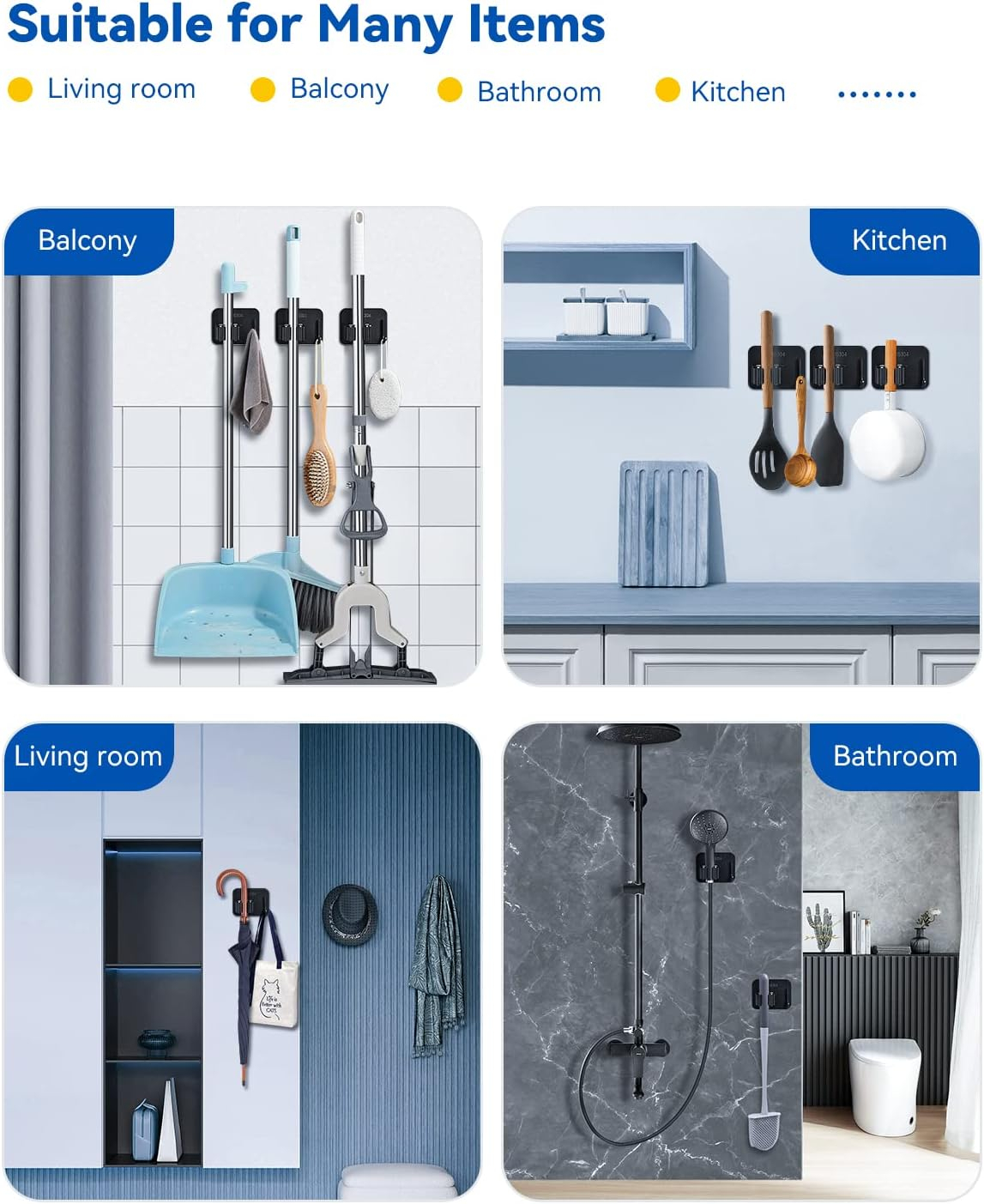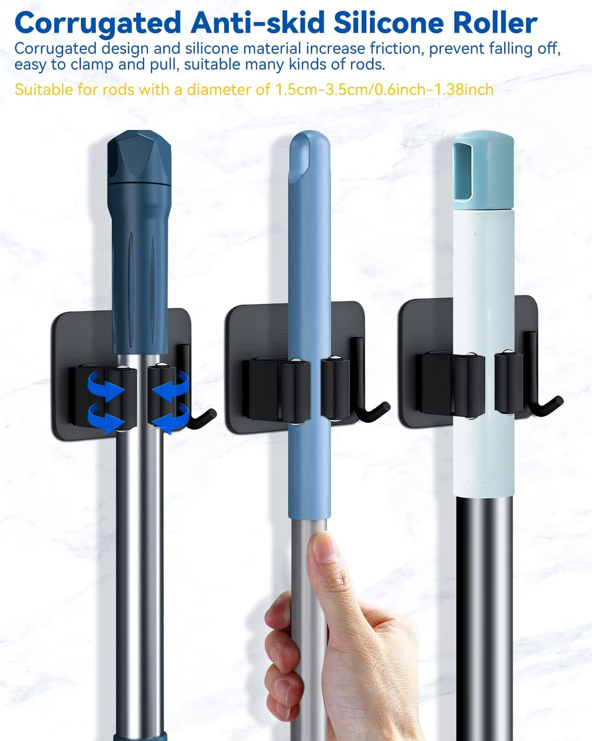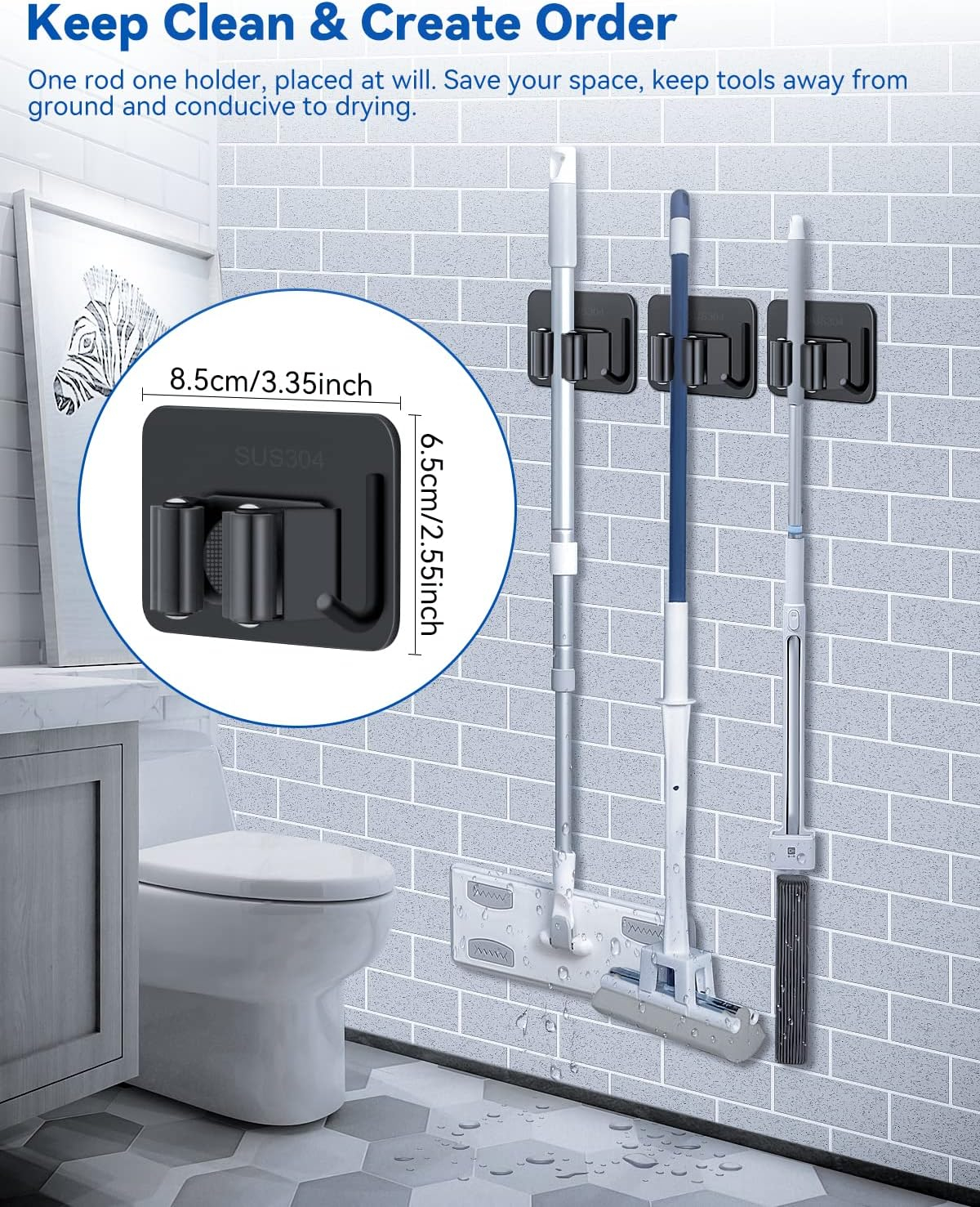 Înființată două metode de instalare Mai ușor de instalat, acest suport de mătură include atât trusa de instalare a unghiilor, cât și plăcuțe adezive pentru diferite suprafețe de perete. Vă recomandăm să utilizați metoda de instalare a unghiilor, care poate suporta până la 3 kilograme de greutate. (Vă rugăm să rețineți că nu trebuie să fie instalat pe suprafețe dure, cum ar fi tapet, pereți de var sau pereți din latex)