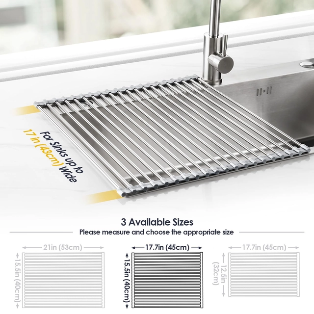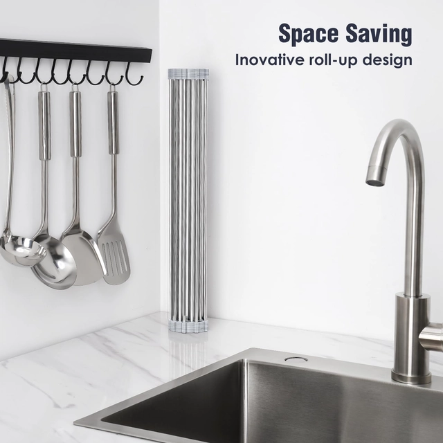 • Suportul nostru de vase peste chiuvetă ajută la uscarea și organizarea vaselor, tacâmuri și alte ustensile, cum ar fi farfurii spălate, vase, boluri, sticle, cești, fructe spălate și legume. Și, de asemenea, poate ca un suport de răcire rezistent la căldură și anti-alunecare pentru a ține vase fierbinți sau produse de panificație, ca un covor de uscare pentru a ascunde un contor de bucătărie pentru a dezgheța unele alimente congelate.