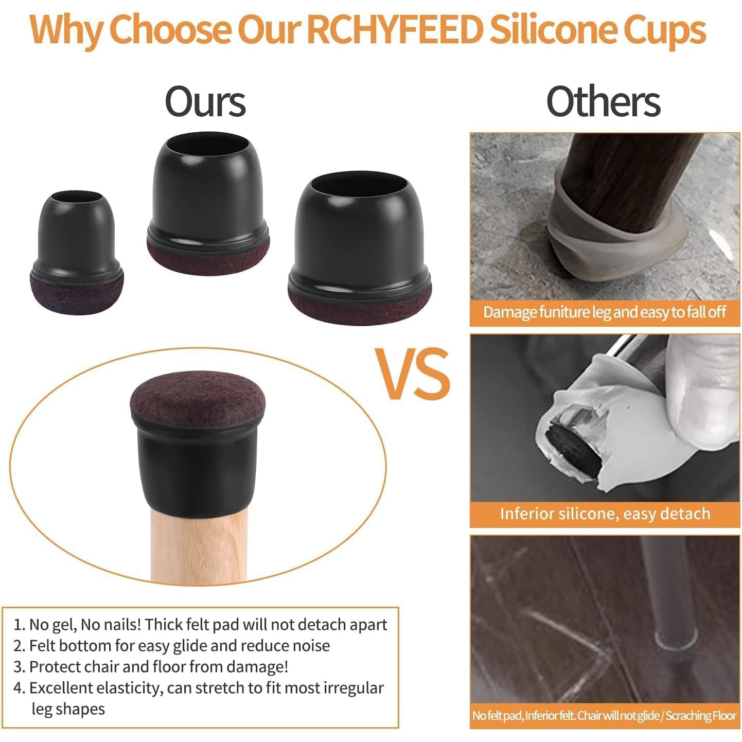 Felul de protectie a picioarelor noastre din otel din silicon, sunt modernizate si impachetate invelite de fund. Capacele picioarelor de mobilier cu glisoare de pasla sunt realizate din material premium WWMO PLASTIC RUBBER, care este durabil si extensibil. Pur si simplu intindeti-va si puneti-le, nu aveti nevoie de instrumente si nu este usor sa cada. Protectoarele picioarelor de scaun si cele simtite sunt integrate ca fiind corpul, astfel incat a fost simtit simtit ca nu se va desprinde niciodata.