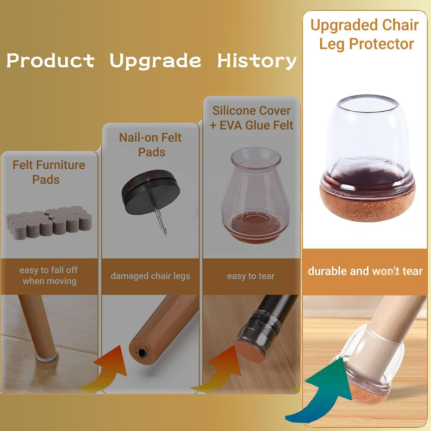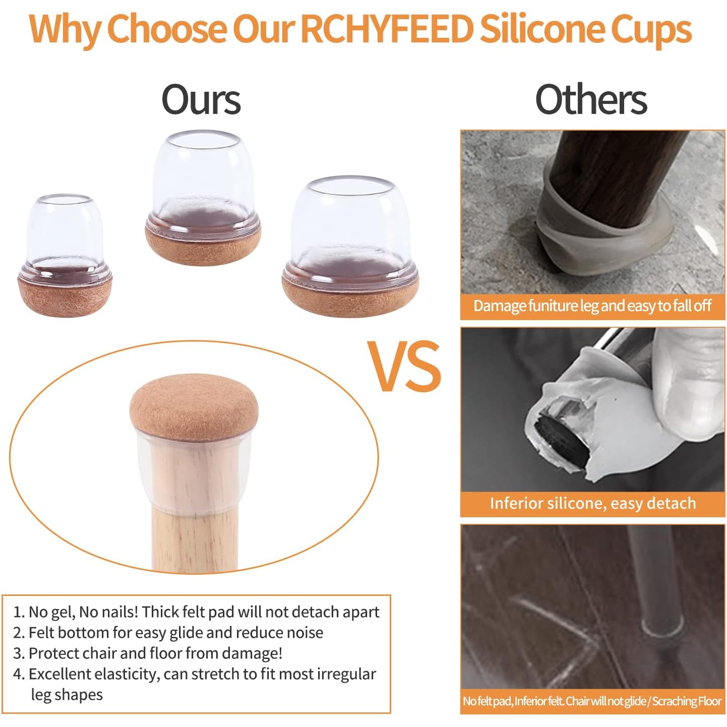 • Felul de protectie a picioarelor noastre din otel din silicon, sunt modernizate si impachetate invelite de fund. Capacele picioarelor de mobilier cu glisoare de pasla sunt realizate din material premium WWMO PLASTIC RUBBER, care este durabil si extensibil. Pur si simplu intindeti-va si puneti-le, nu aveti nevoie de instrumente si nu este usor sa cada. Protectoarele picioarelor de scaun si cele simtite sunt integrate ca fiind corpul, astfel incat a fost simtit simtit ca nu se va desprinde niciodata.