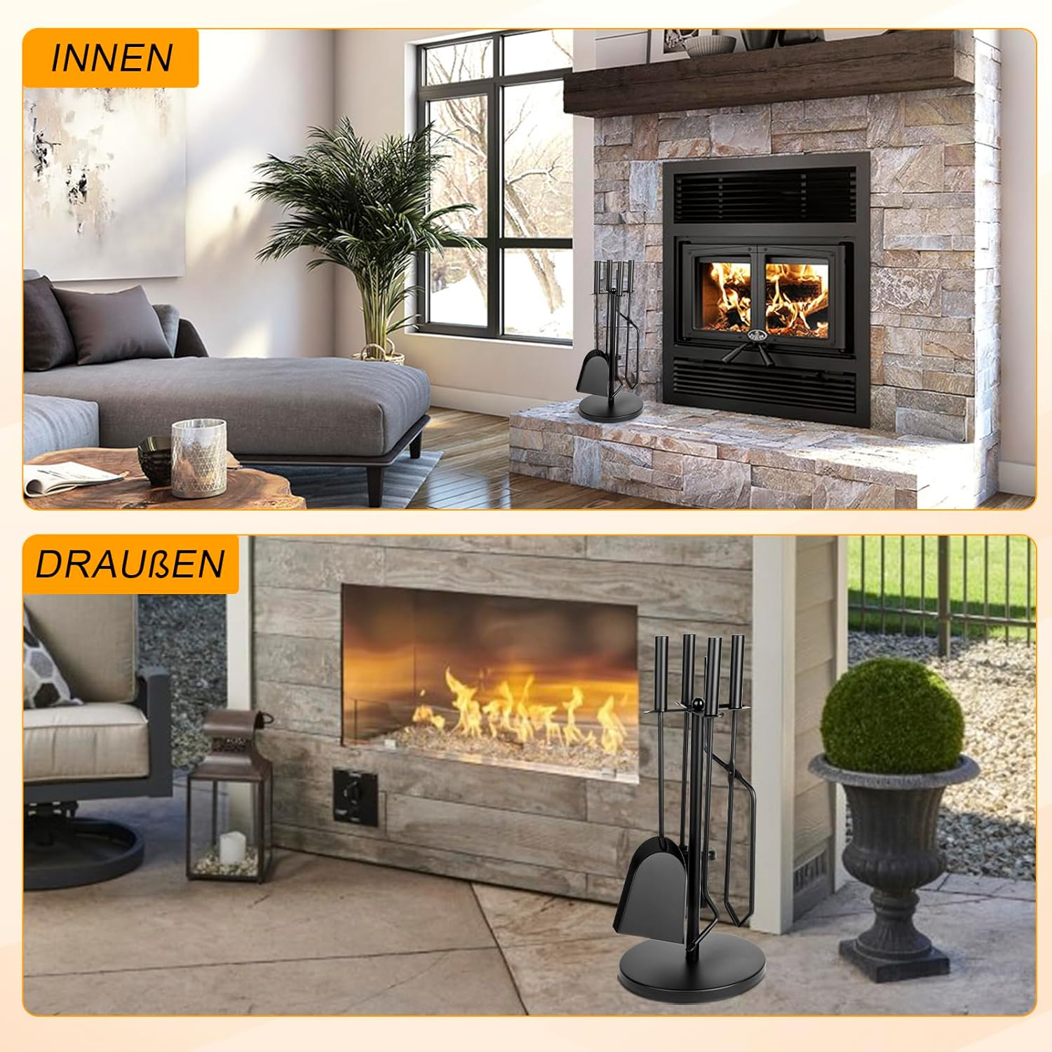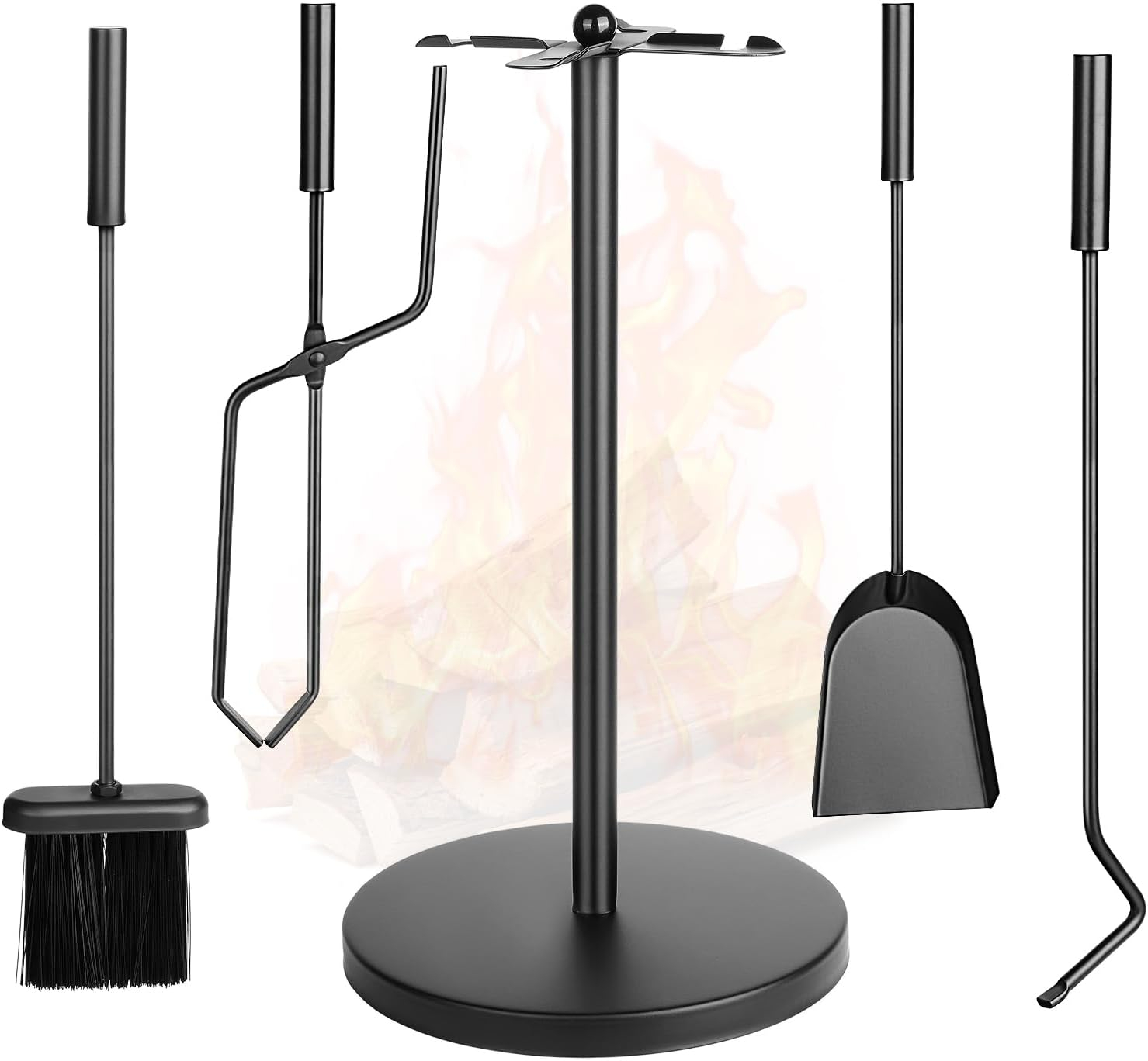 Set de scule de șemineu din 5 piese cu lopata de cenușă, mătură, poker, set de șemineu și suport, accesorii interioare pentru șemineu cu mâner din lemn.