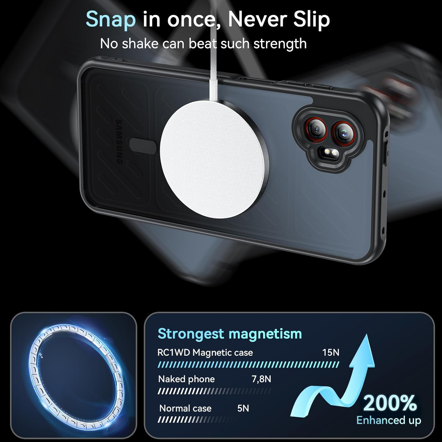 Magnegalismul carcasei Samsung XCover 7 Pro este super puternic, poate fi conectat ferm cu toate accesoriile magnetice, cum ar fi încărcătoarele magnetice, portofelele, pachetele de baterii, suporturile mașinilor etc.