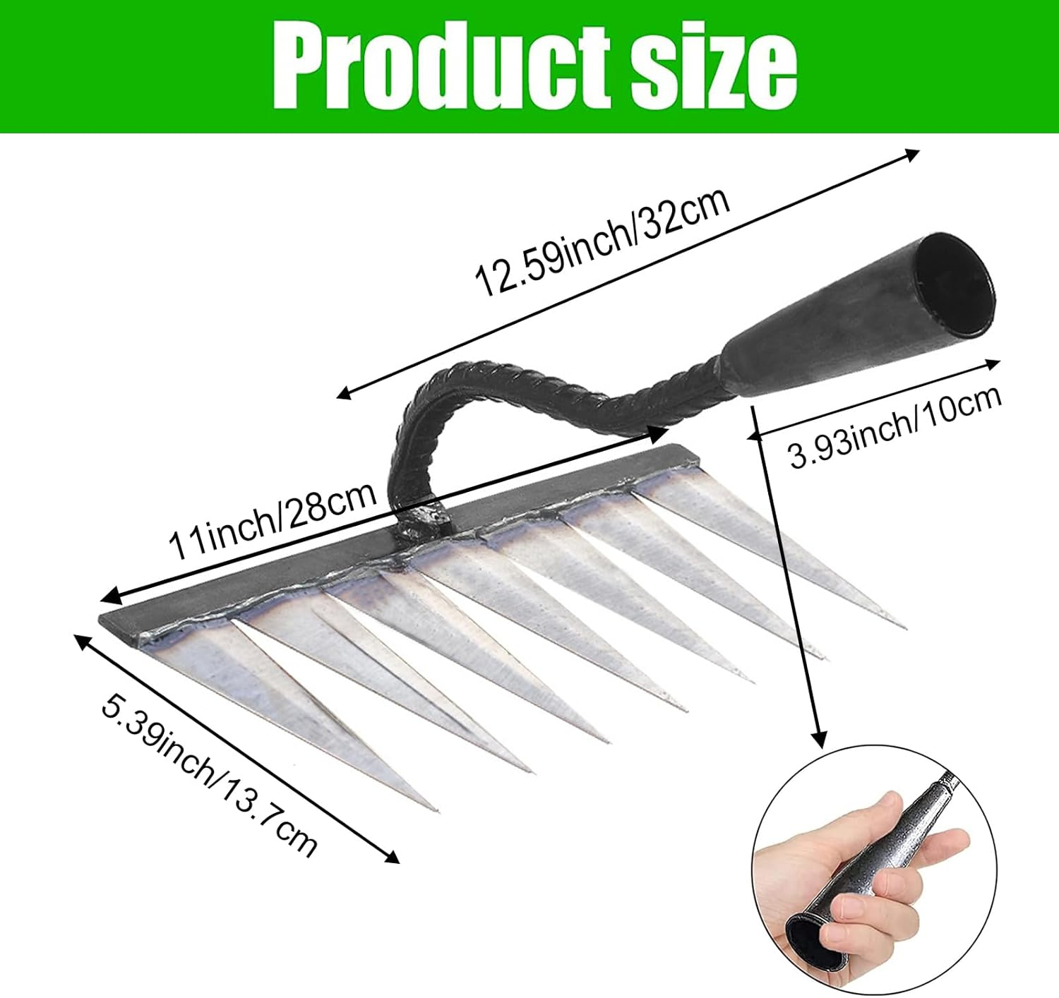 • Design eficient pentru grădinărit: datorită designului special 7-prang, grebla de grădină poate penetra cu ușurință diferite tipuri de sol și poate fi folosită pentru grădinăritul zilnic, cum ar fi plivirea, slăbirea solului și plantarea legumelor, tăierea rădăcinilor de buruieni. Unelte de mână de grădină ușoară și de economisire a forței de muncă.