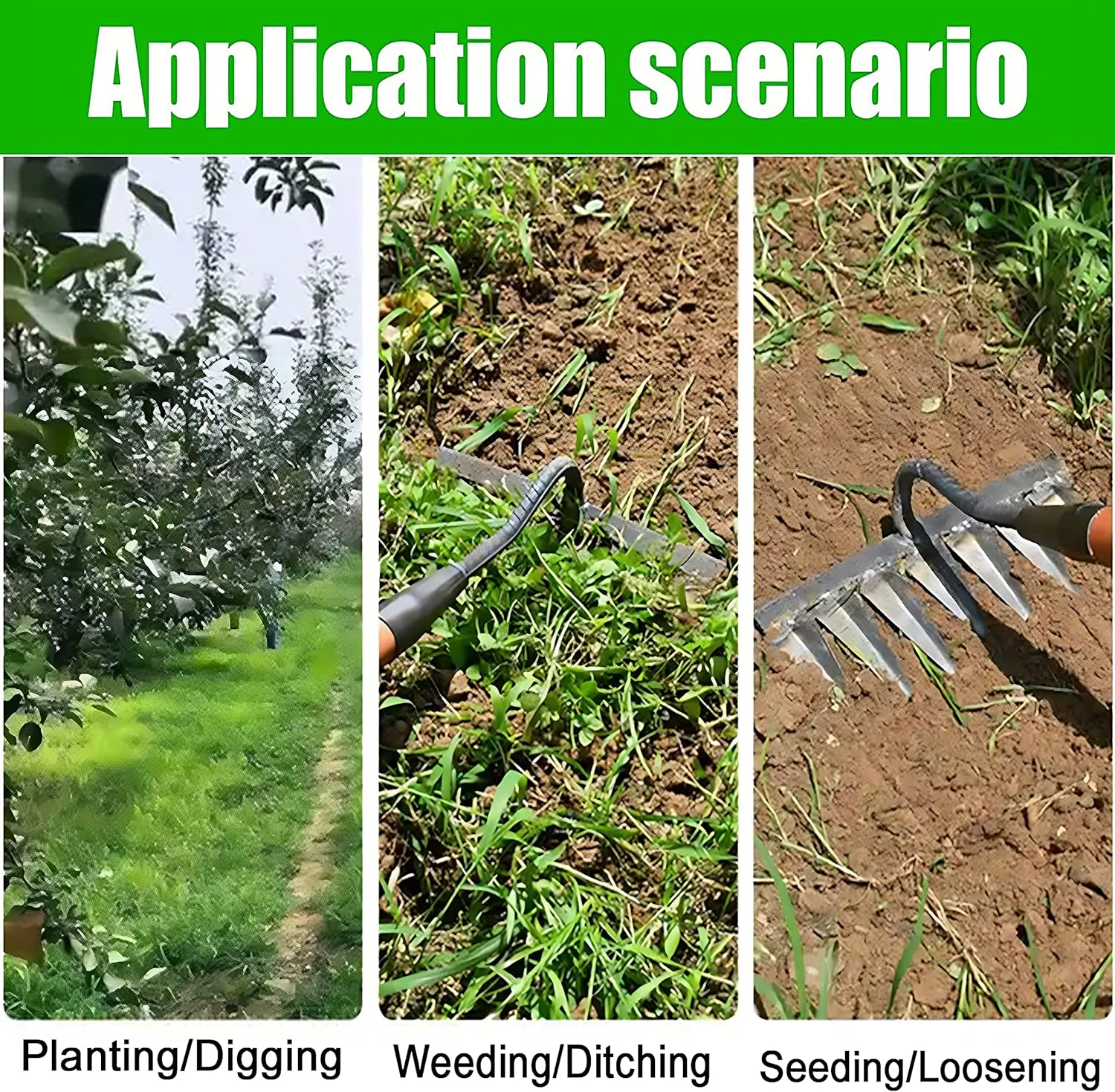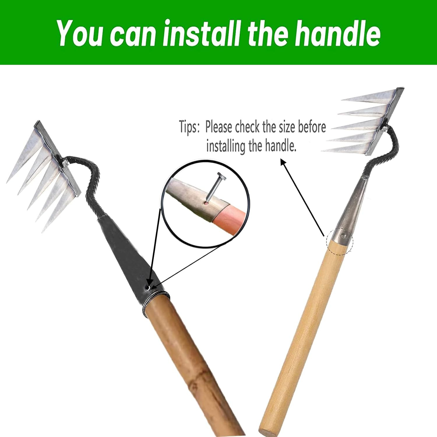 • Ușor de utilizat: mânerul poate fi conectat la un băț de lemn extins. Pur și simplu atașați un mâner standard din lemn la sapă pentru a-l transforma într-un tăietor de buruieni cu un mâner lung. Acest lucru face ca greblele de grădină grele să fie mai puțin consumatoare de forță de muncă și mai eficiente și puteți buruienile cu buruieni mai mult timp fără a vă răni (fără mâner).