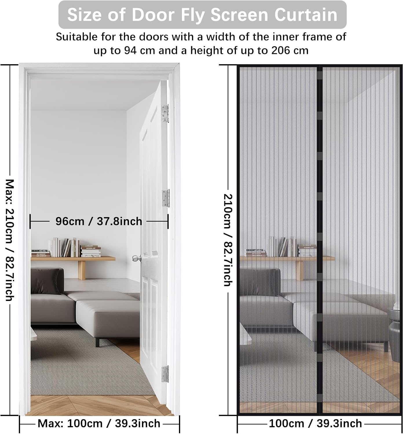 SizeSimiNoii Viruşi pentru măsura uşilor 100*210cm (W*H). Funcționează bine cu ușa glisantă, ușa de patio, ușa din față și multe altele! Și perdea de muscă pentru ușă poate fi îndepărtată și pliată pentru spălare sau depozitare temporară în afara sezonului. Vă rugăm să măsurați dimensiunea ușii înainte de a cumpăra pentru o potrivire perfectă.