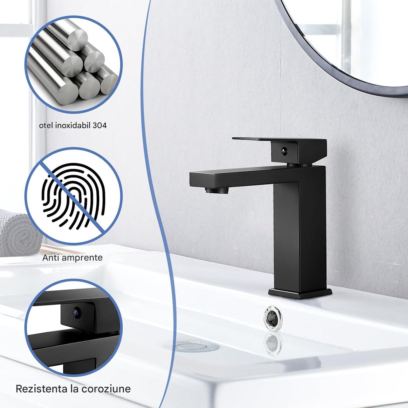 • Baie de la robinet negru: robinetul negru din chiuvetă este fabricat din oțel inoxidabil SUS304 cu un strat negru mat, care este rezistent la coroziune, rezistent la rugină și durabil. Suprafața mat neagră previne eficient reziduurile de amprente, iar suprafața este ușor de curățat cu o cârpă moale.