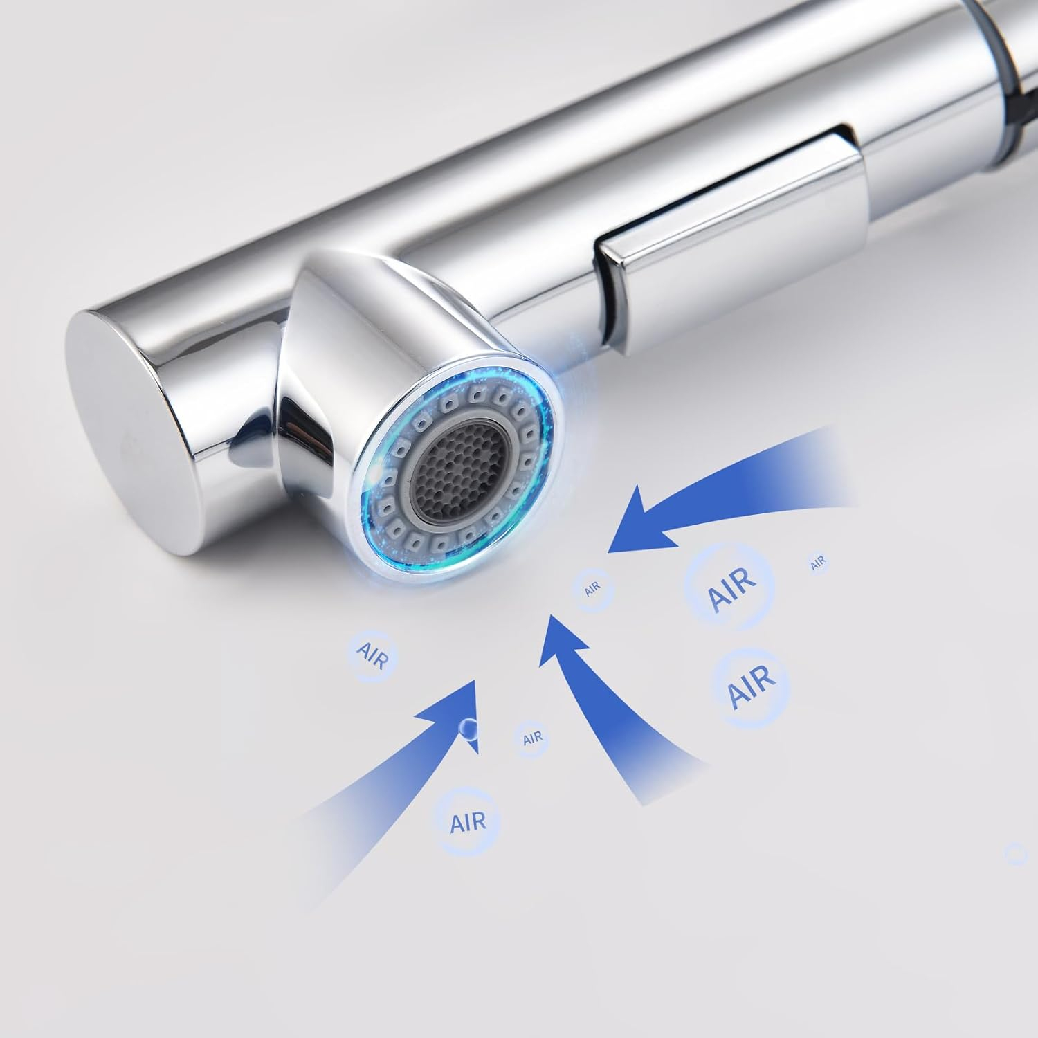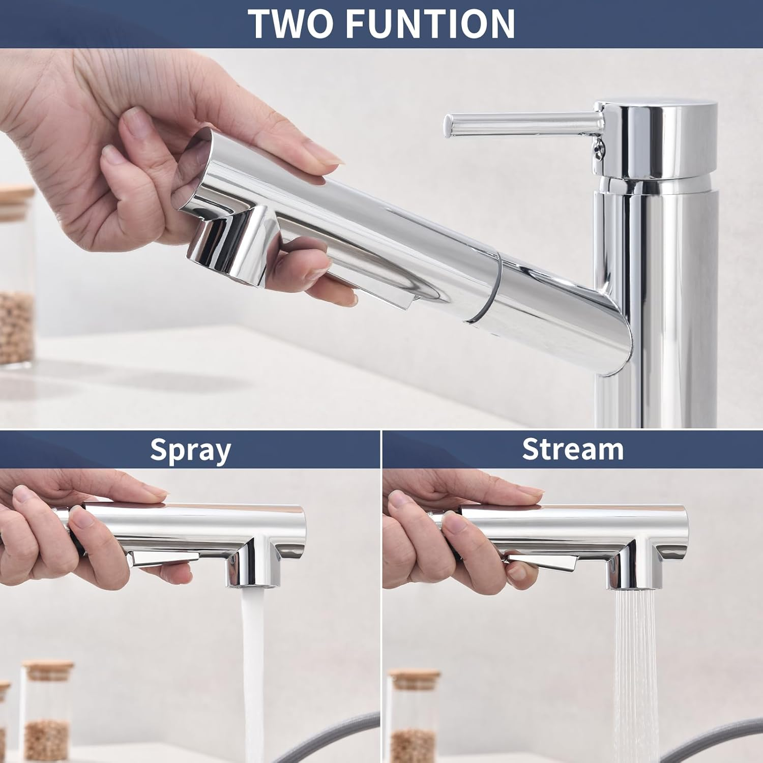 2 moduri de curgere a apei și temperaturi: robinetul de bucătărie extensibil oferă două moduri: jet de duș și jet puternic. Indiferent dacă doriți să curățați fructele, legumele, vasele sau vasele, comutarea modurilor de pulverizare va îndeplini cerințele dvs. diferite. Cu două furtunuri de conectare, puteți amesteca apa caldă și rece și o puteți folosi tot timpul anului.