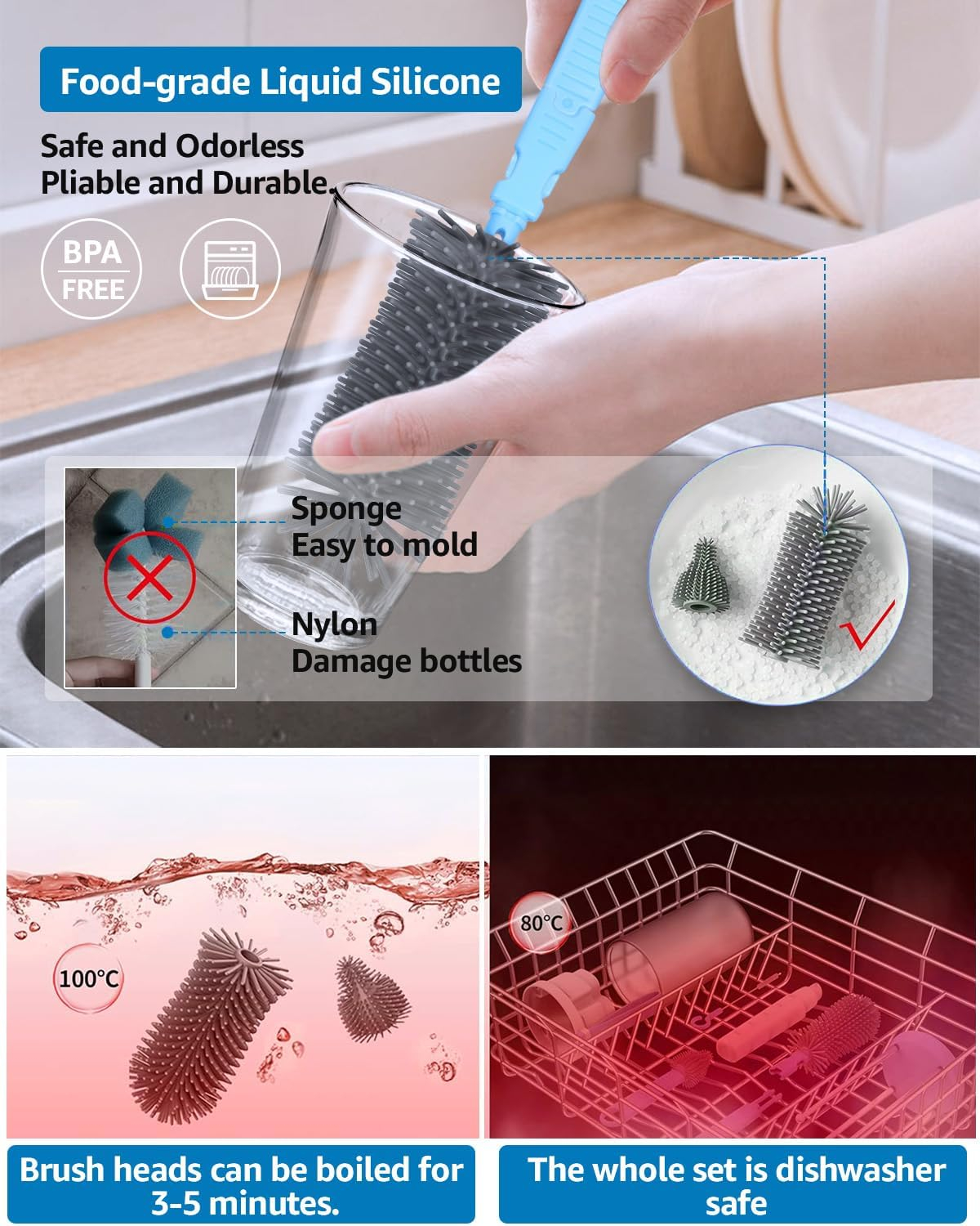 Înființat retractable Baby Bottle Cleaner Brushs The 9.8" sticlă de curățare perie cu peri de silicon și o baghetă extensibilă care ajunge cu ușurință pe fundul sticlei pentru a curăța reziduurile de lapte. Peria de sticlă de apă poate fi desprinsă în două părți și plasată într-un suport pentru uscare ușoară. Fiecare perie de sticlă are un mâner caneluit fără alunecare pentru o prindere ușoară. Păstrați toate pensulele și gadgeturile de sticlă din silicon într-o singură carcasă, ușor de utilizat, ușor de depozitat.