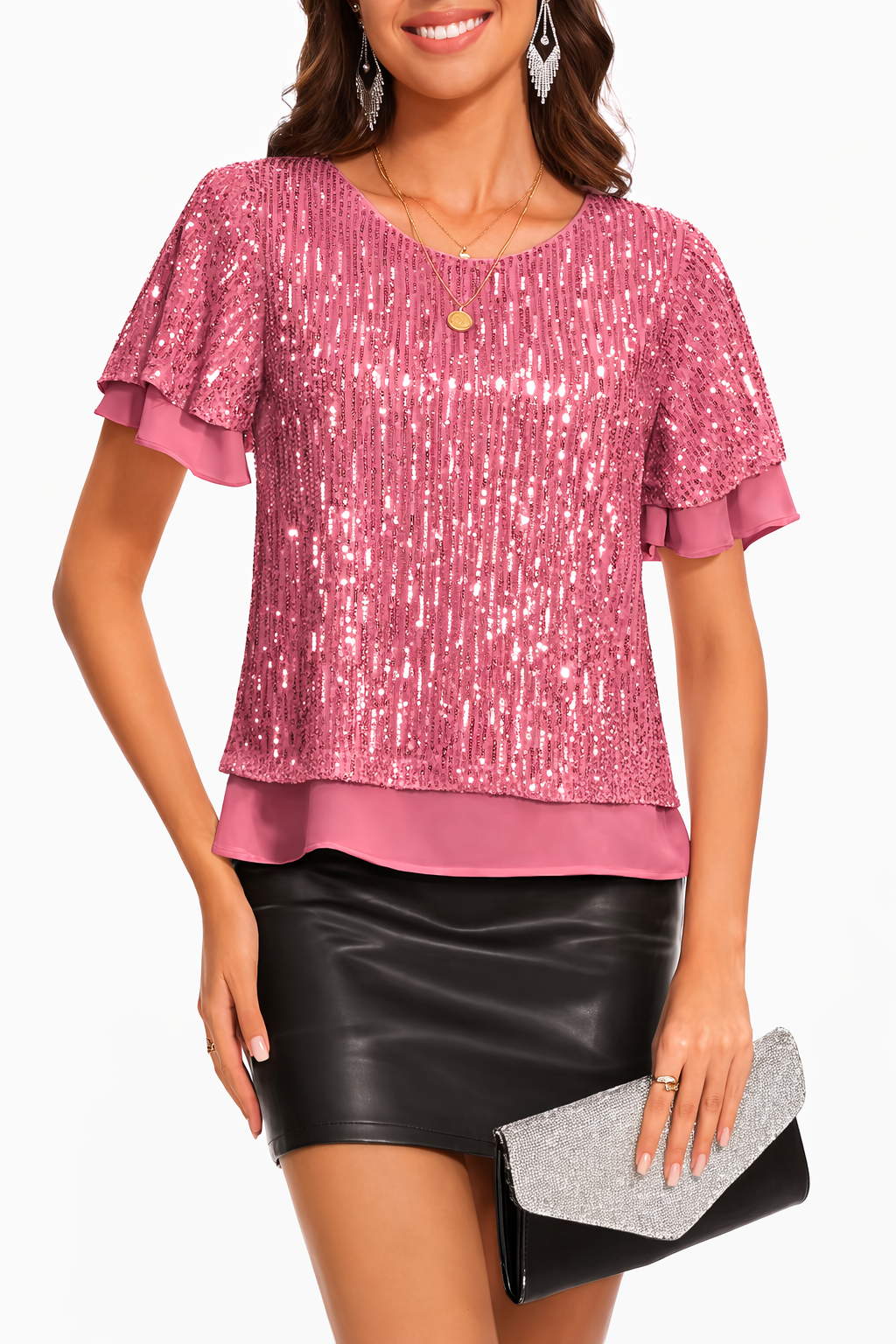 Design unic: Această bluză cu mânecă scurtă din paiete de gât rotundă are mâneci clasice de volan, adaugă detalii distractive și stil elegant ținutei, drapa curgătoare slăbește linia brațului, făcându-te să arăți măgulitor și încrezător în briză