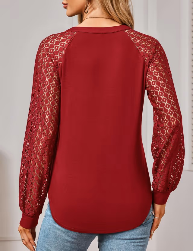 • Caracteristici: Chic feminin superioară cu gât în V, mâneci lungi cu dantelă raglan și tiv rotund pentru casual și elegant.