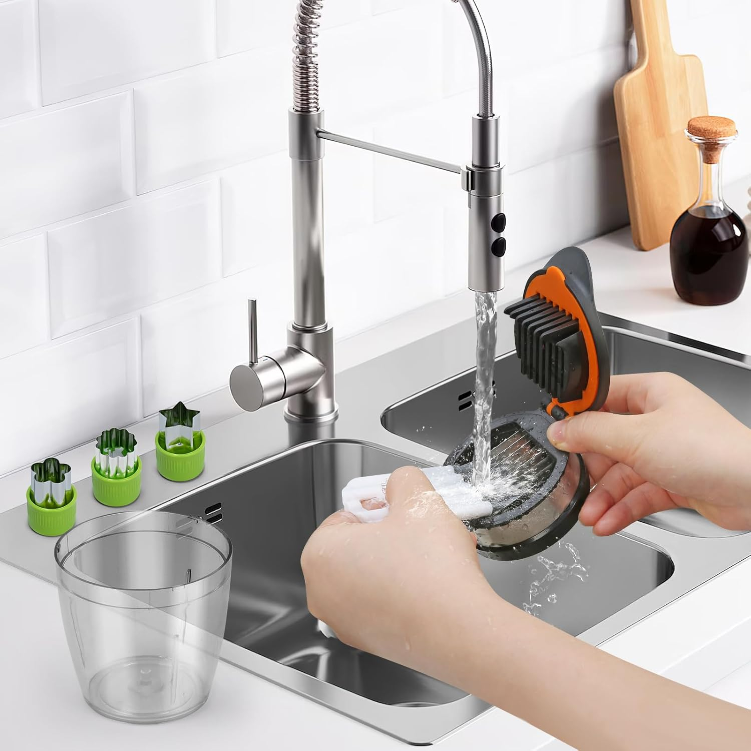Un gadget de bucătărie destul de frumos: este frumos și robust, lamele sunt ascuțite și atașamentul nu este atât de greoi asamblat încât nu îl mai puteți curăța bine. Lamele sunt acoperite cu un strat suplimentar de plastic pentru a respinge reziduurile alimentare care încă se lipesc de lame. Un dispozitiv esențial pentru oricine îi place să încorporeze fructe proaspete în mesele sau gustările lor.