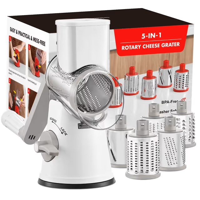 Actualizat la versiunea de cinci blem: în satisfacerea mai multor nevoi, am introdus recent o lamă de ras de gheață și o lamă de bucăți fine în versiunea originală cu trei lame. Această răzătoare de brânză 5 în 1 vă oferă opțiuni diverse pentru grătar, feliere, zdrobire și bărbierit cu gheață
