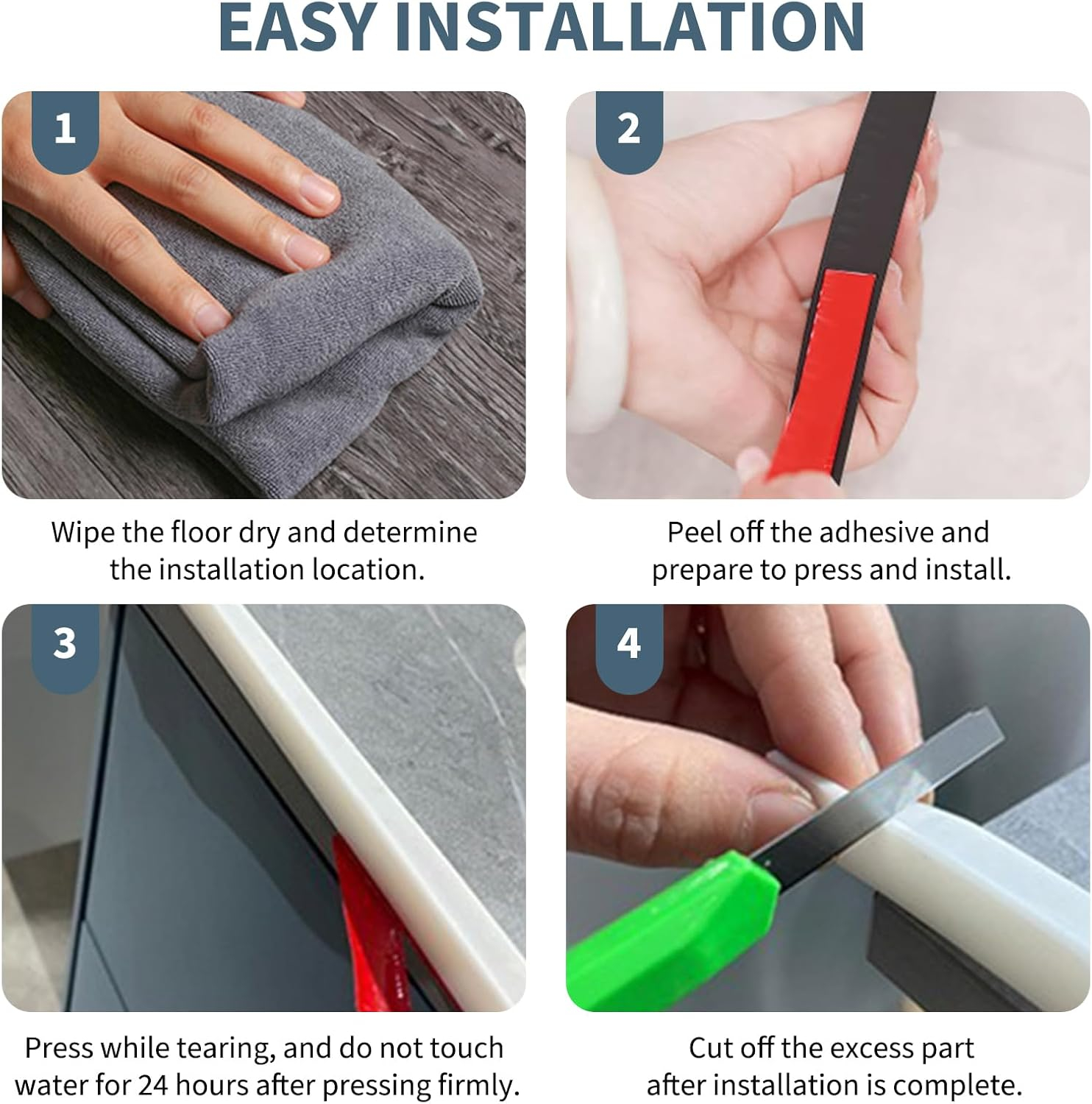 DIMENSIONĂRI DEtreURI: 1.3cm (H) x 2cm (W), sigiliul nostru de duș poate fi instalat în goluri între etaje, chiuvete, blaturi și ziduri, pentru a împiedica apa să intre în spațiile intermediare și formarea de pui de matriță. Puteți alege să-l instalați orizontal sau vertical, în funcție de dimensiunea slotului. Reamintire: bariera apei este de numai 12mm înălțime și, prin urmare, nu poate îndeplini cerințele de averse accesibile și zone mari de stocare a apei