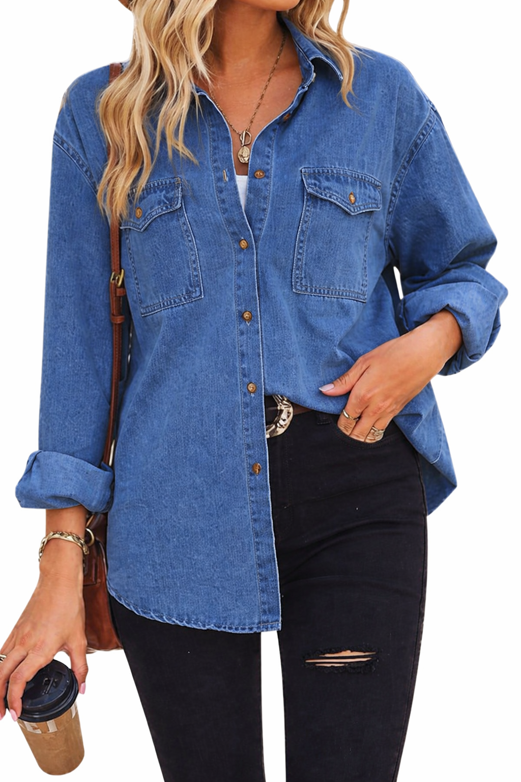 • Caracteristici: Această cămașă clasică din denim pentru femei are reveruri, două buzunare de piept și închidere a nasturilor.