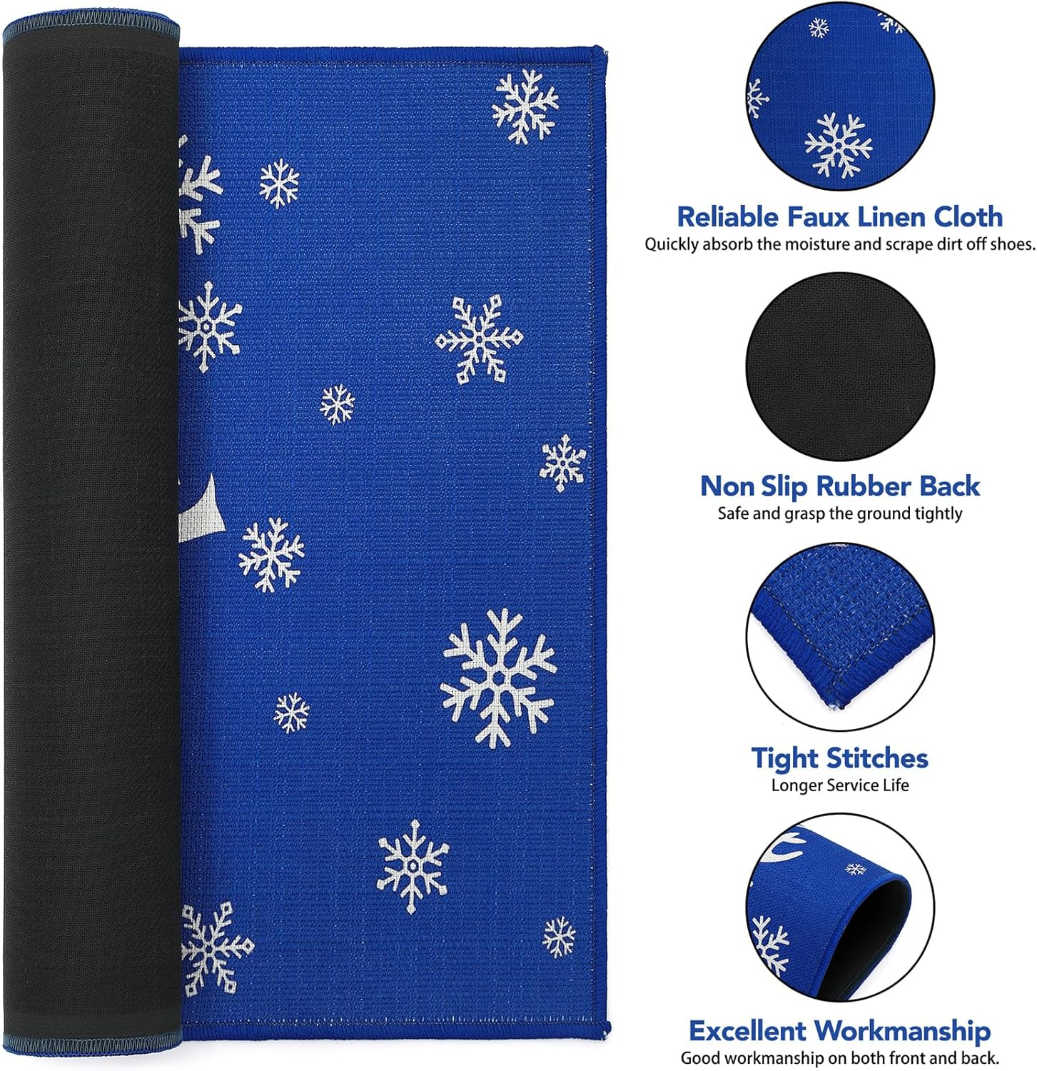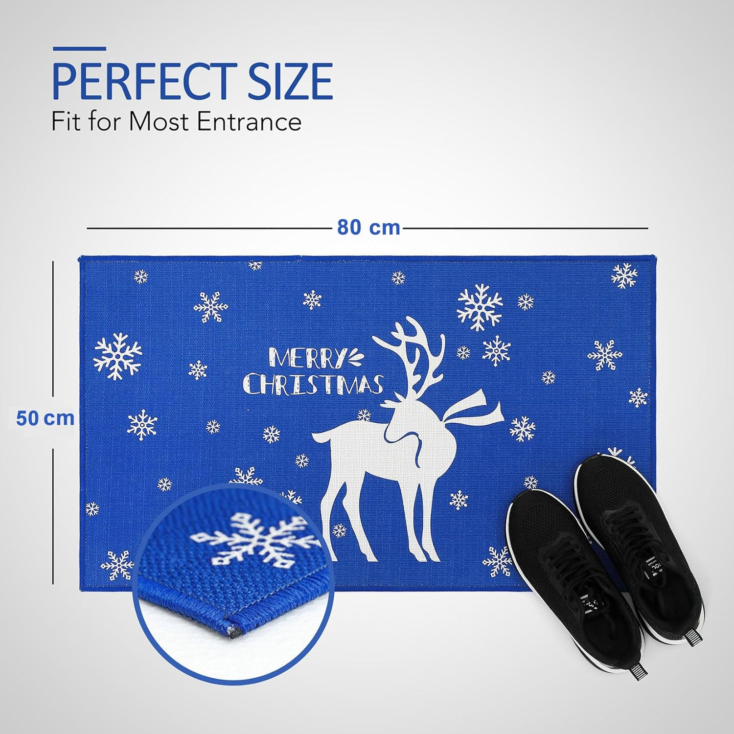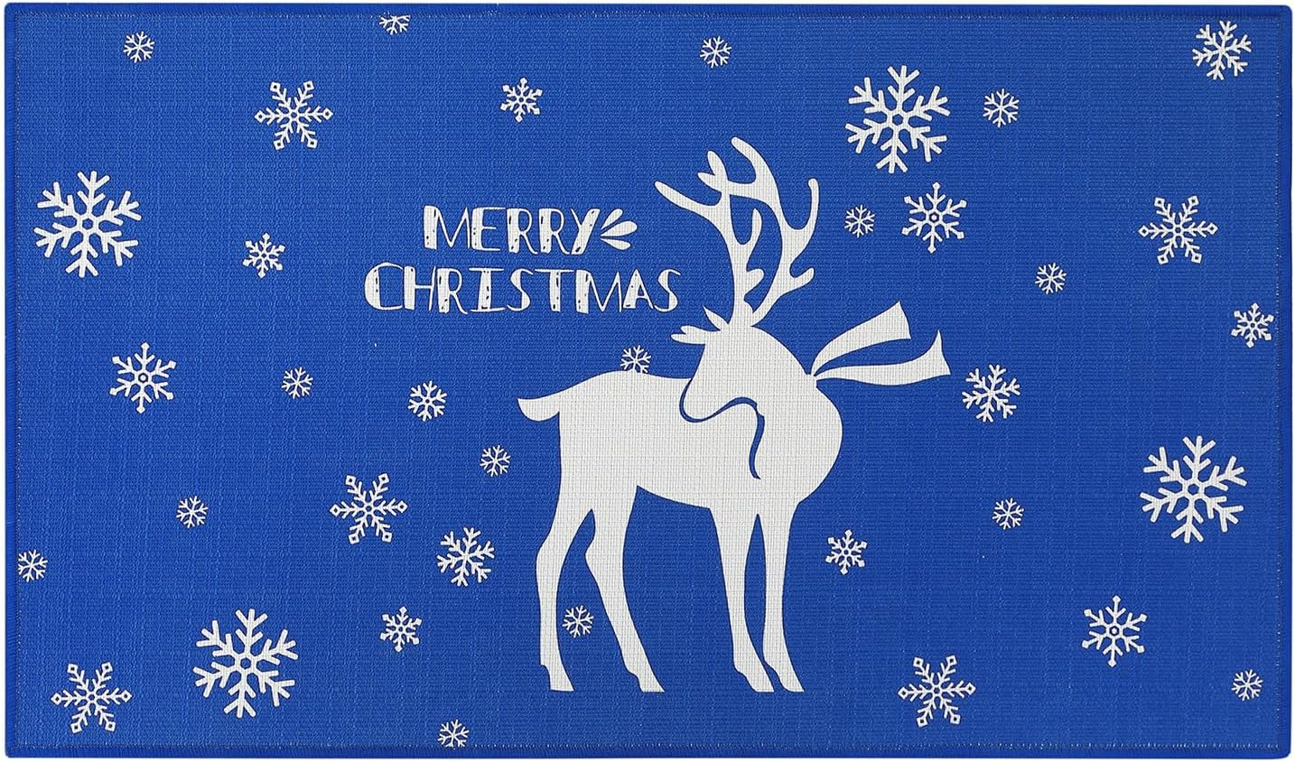 Modelele imprimate clar sunt create printr-o tehnică specială de imprimare. Modelul fulgilor de zăpadă se plimbă pe tot covorul roșu, iar în mijloc este imprimat cu litere albe "Crăciun fericit". Aceste preșuri sunt perfecte pentru decorarea podelelor și oferirea oaspeților o primă impresie excelentă a casei tale.