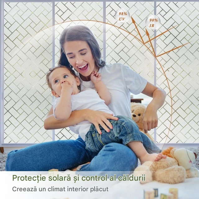 Protecție UV & Izolare Filmul opac de confidențialitate poate bloca razele UV și insectele în timpul verii și poate reduce transferul de căldură în timpul iernii. De asemenea, protejează împotriva decolorării mobilierului.