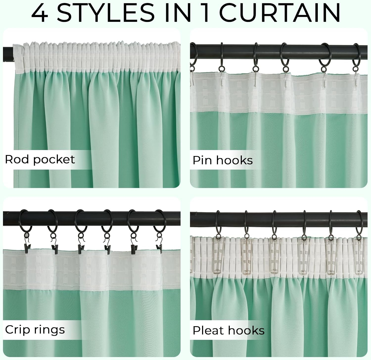 METODELE MAI MULTE ATÂRNATE: Această perdea suportă trei metode de agățare, care sunt panglia ciufulită, inelul agățat și buzunarul tibiului. Puteți alege cea mai potrivită metodă de instalare în funcție de stilul tijei perdelei și de stilul de decorare a casei, pentru a satisface diferitele nevoi decorative și cerințele personalizate