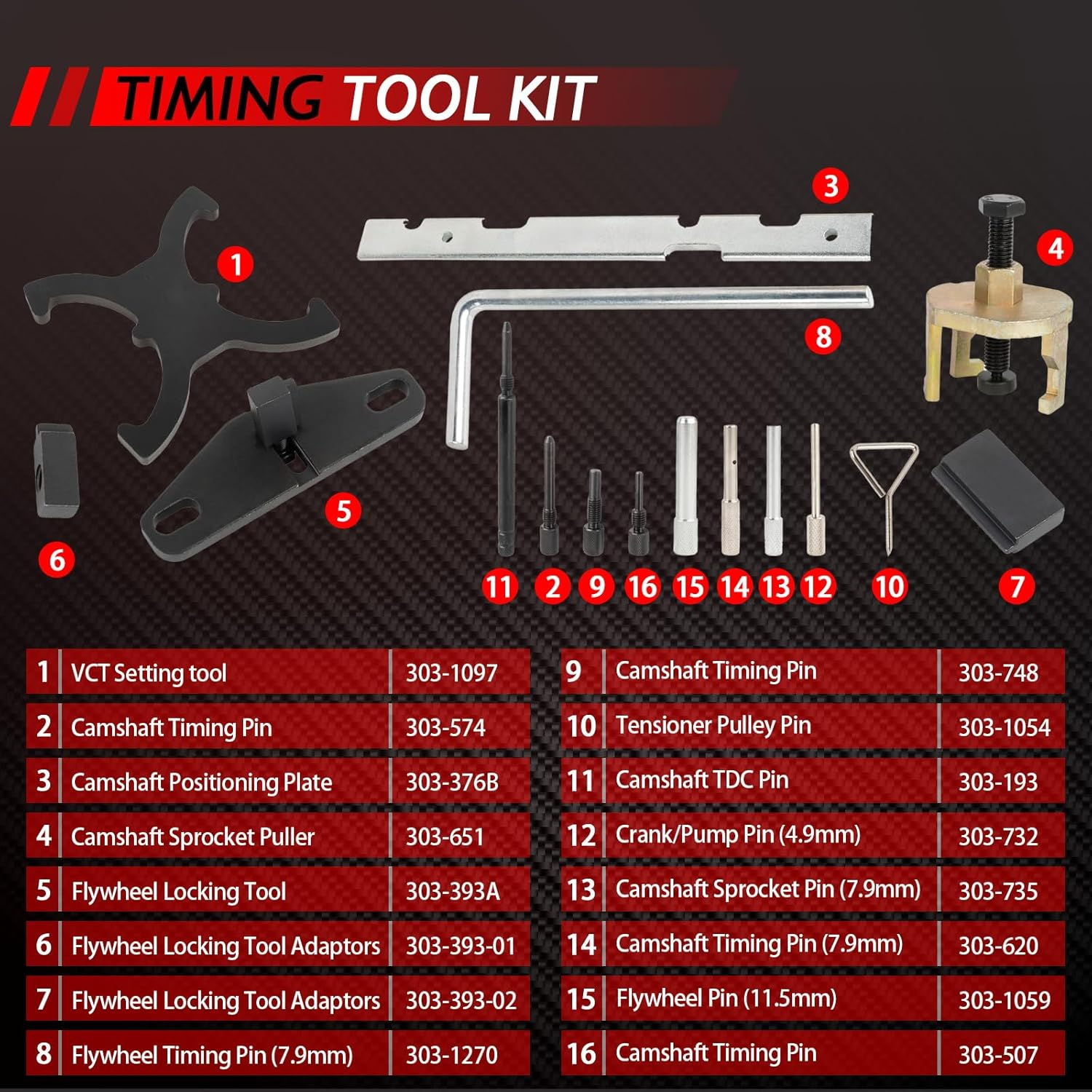 Piese incluse: diverse ace de control și un instrument de îndepărtare a arborelui cu came, arborele cu came și instrument de blocare a roților,