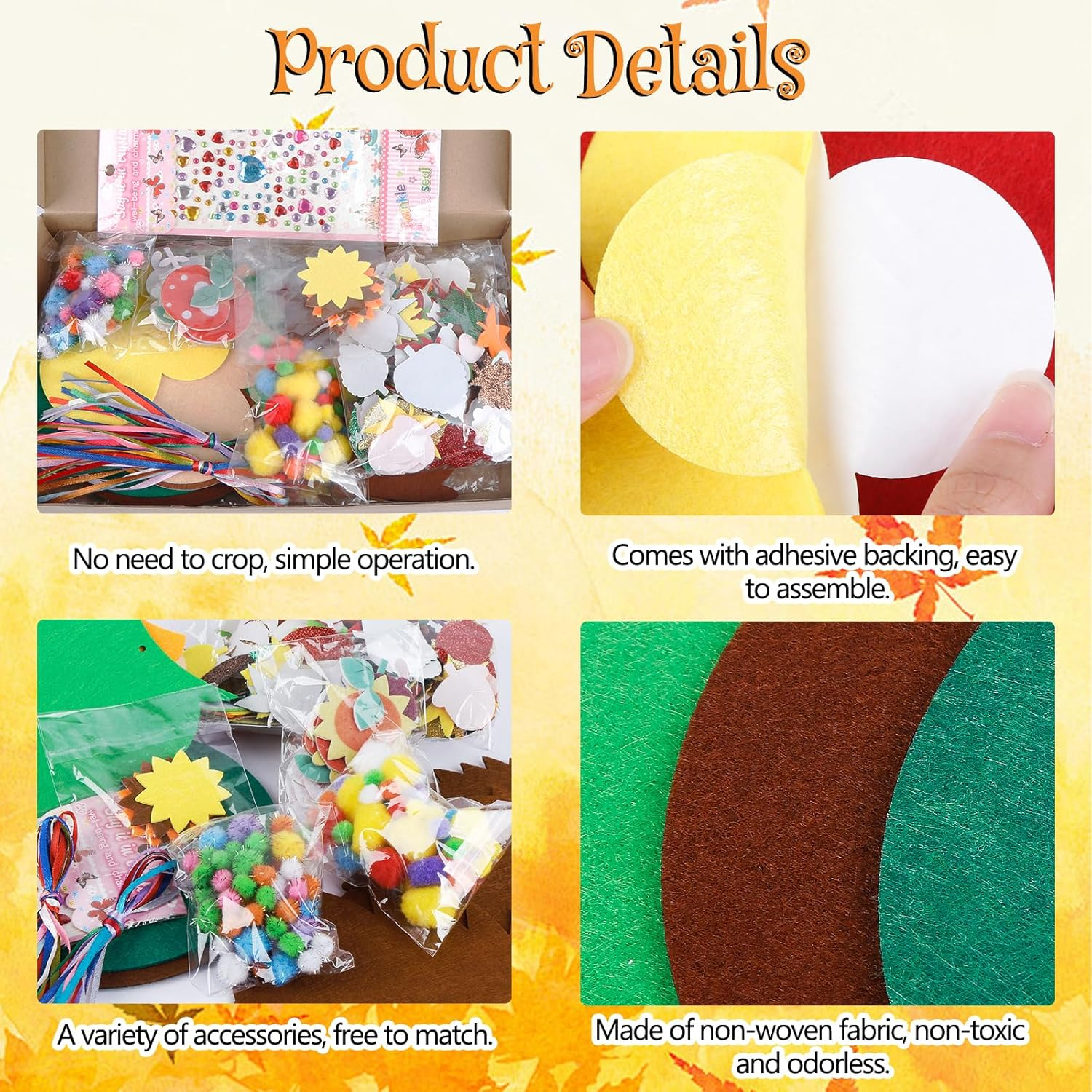Materiale de înaltă calitate Aceste kituri de contor ale copiilor sunt realizate din țesătură de pâslă de înaltă calitate, care este moale la atingere, viu colorată, netoxică și inofensivă, iar copiii o pot folosi cu încredere. Toate părțile din artele și meșteșugurile pentru copii au propria lor susținere adezivă și au fost tăiate în avans, astfel încât acestea să poată fi ușor asamblate pentru a face un set frumos de meșteșuguri pentru copii de toamnă.