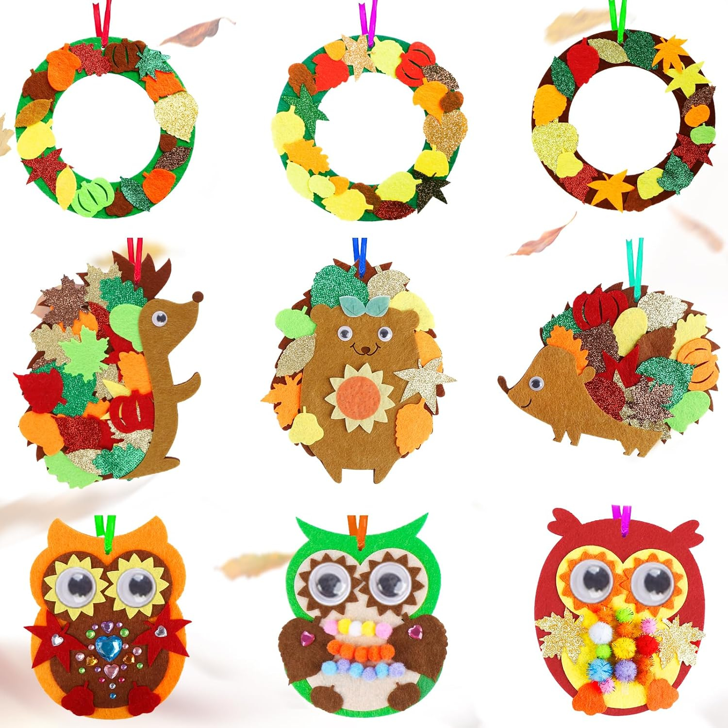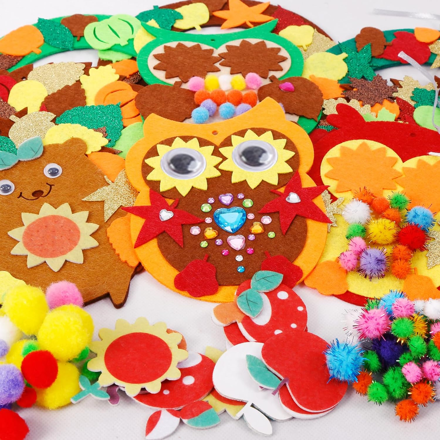 Diferite accesorii de toamnă Setul de artizanat pentru copii conține o varietate de accesorii, inclusiv părți de coroană, părți de arici, părți de bufniță, ochi oscilabili, panglici colorate, accesorii autocolante (frunze, nuci, ciuperci, dovleci, flori etc.), două stiluri de pompoane, autocolante de diamante, bandă dublă, lipici etc.