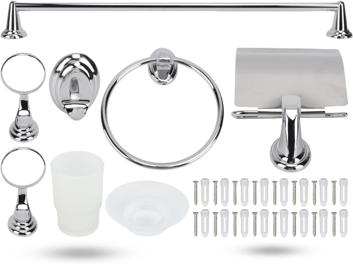 ACCESORII INCLUSE: 1 x Suport pentru prosoape, 1 x Suport pentru prosoape, 1 x Suport de hârtie igienică, 2 x bază, 1 x toiag lung, 1 x cârlig de pânză, 1 x placă de sticlă, 1 x periuță de dinți, 1 x salt din săpun, 16
