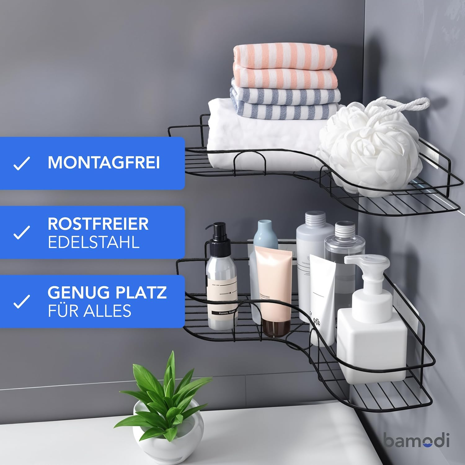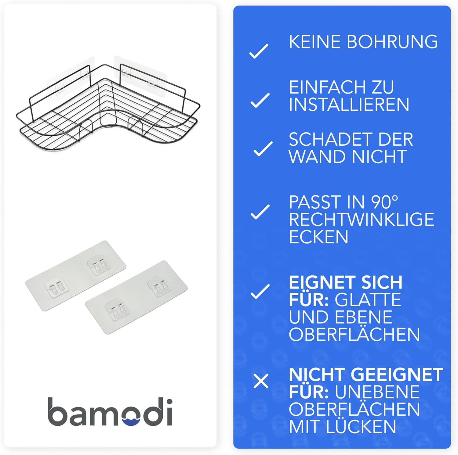 Design robust – raftul adeziv de duș din colțul Bamodi este fabricat din plastic robust și are o capacitate de încărcare de până la 5 kg pe raft. Este rezistent la rugină și oferă o durată lungă de viață.