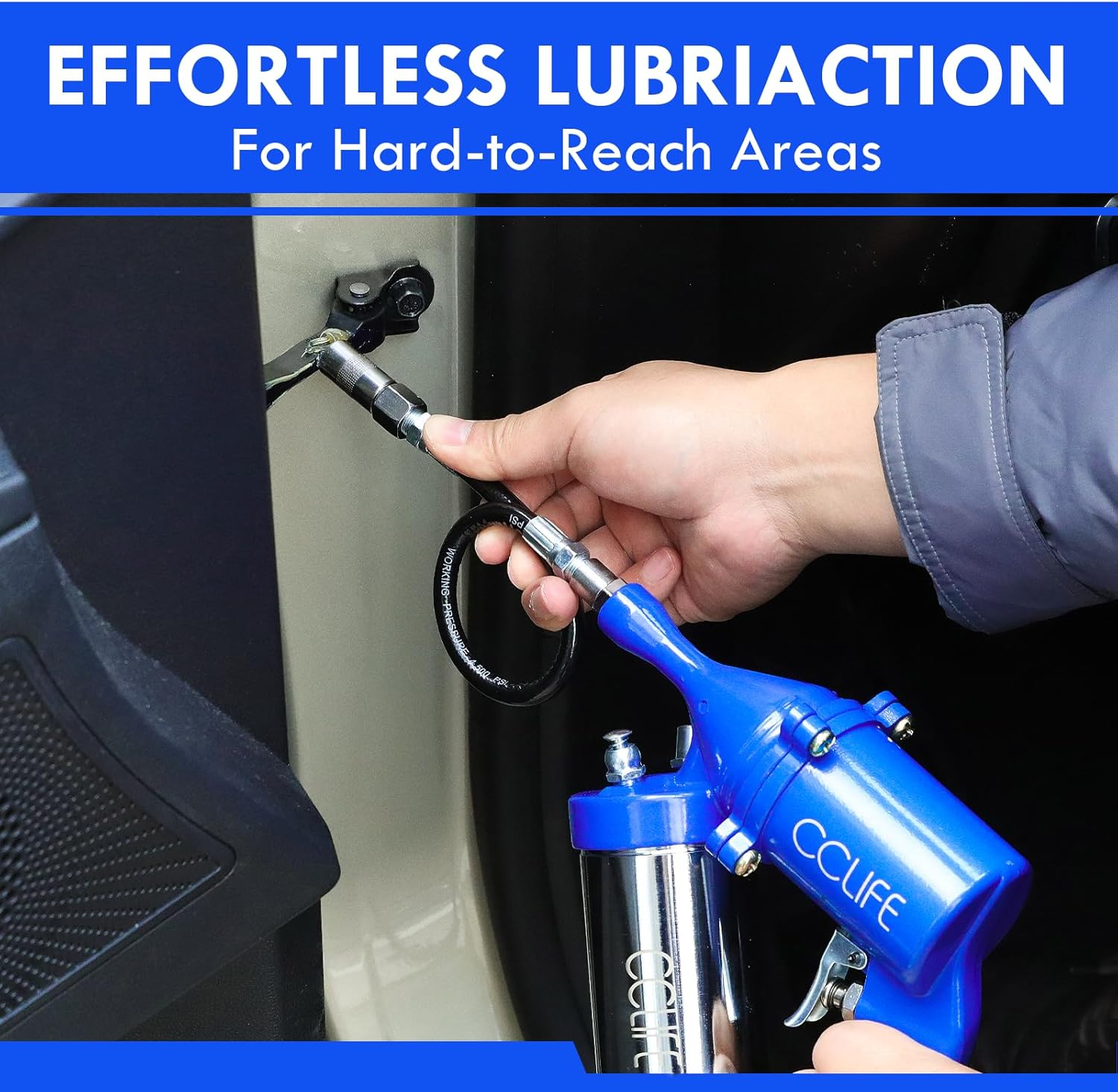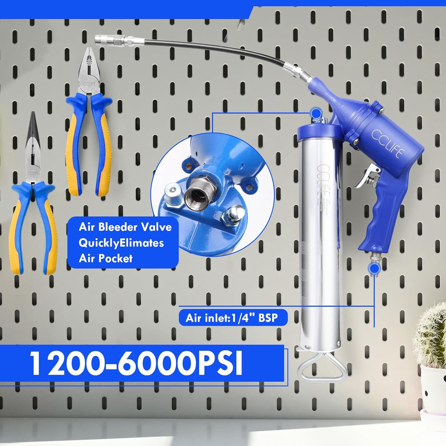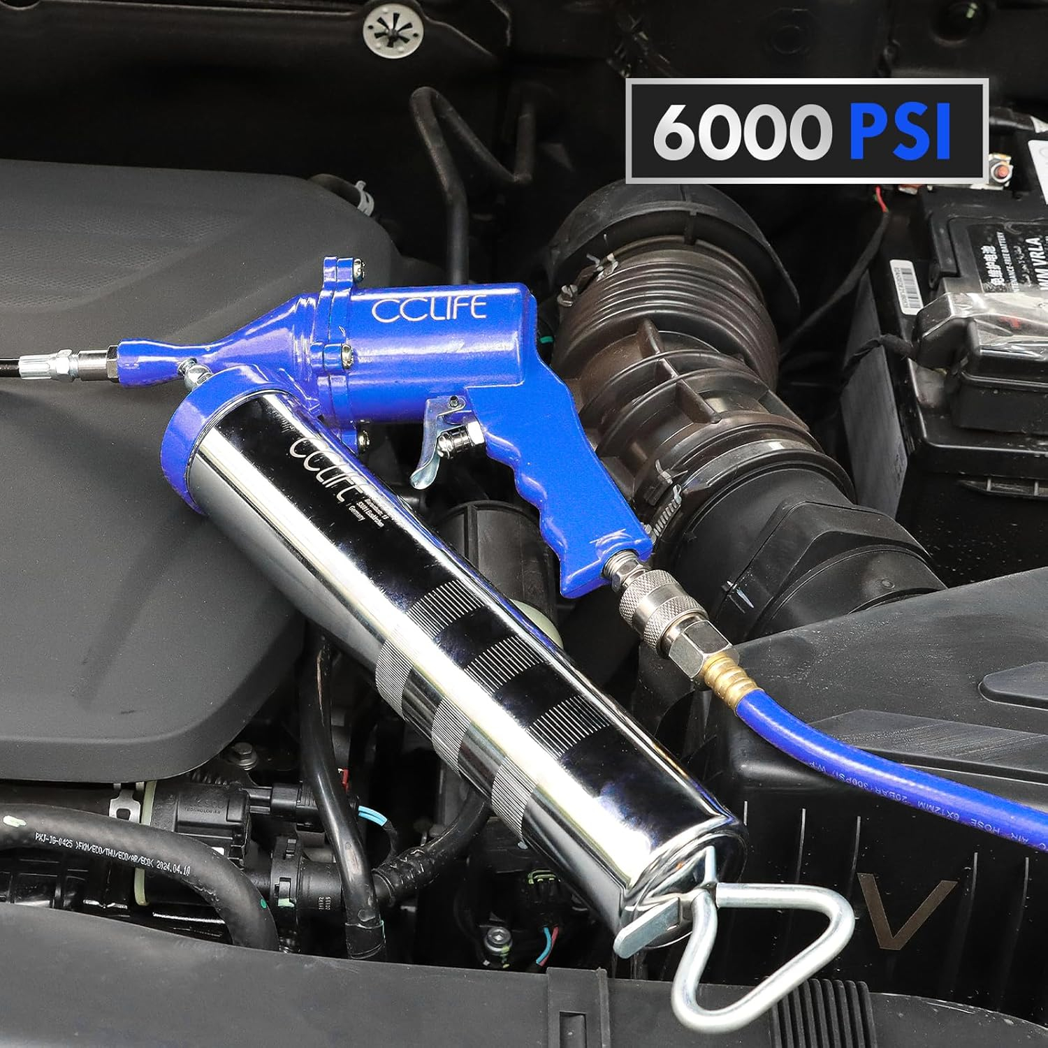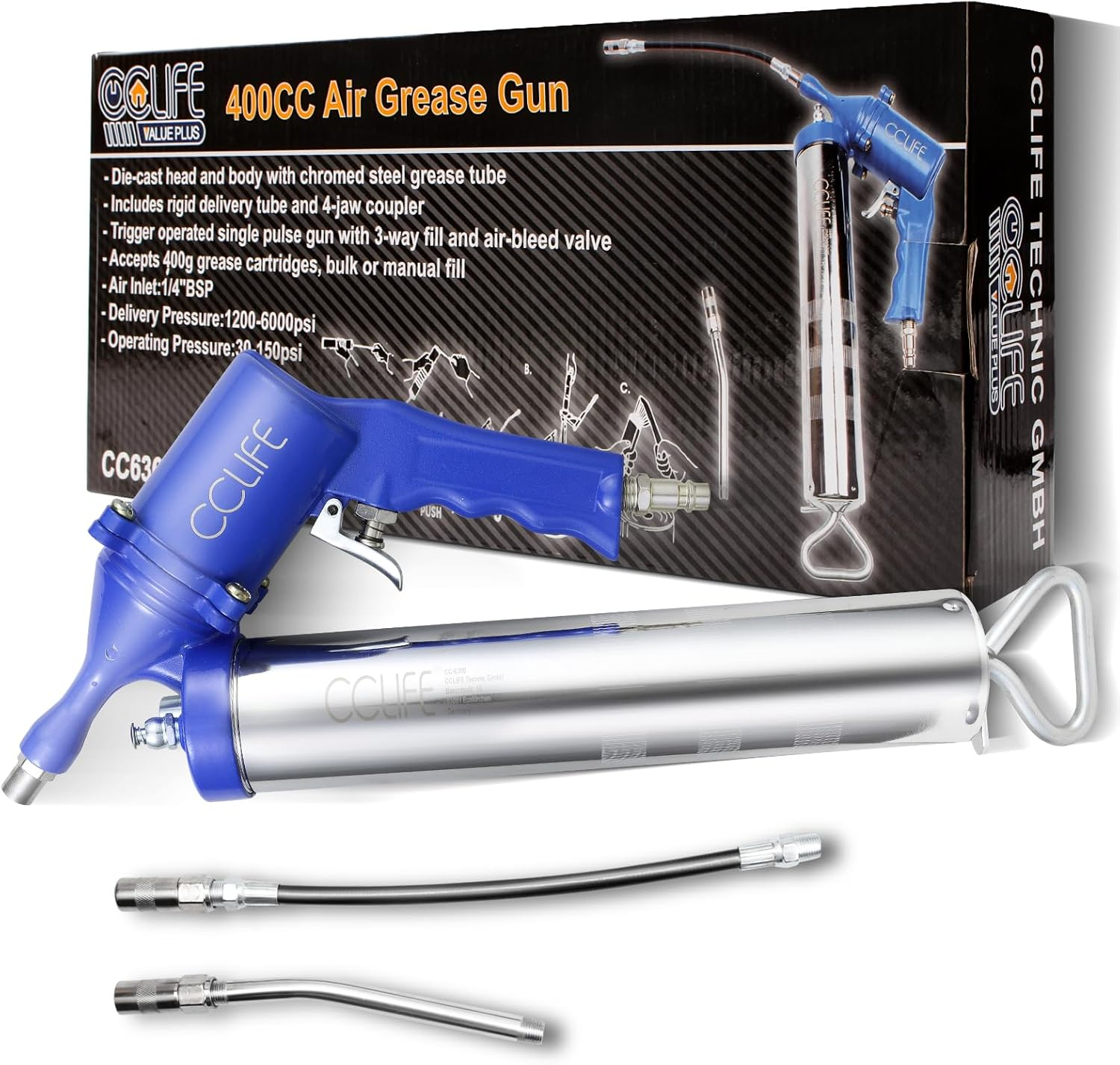 Informații tehnice: presiune de lucru 30-150 PSI; presiune de grăsime 1200 PSI - 6000 PSI; 12 inch (30,3 cm) furtun flexibil, extensie metalică (nu 400 g unsoare inclusă)