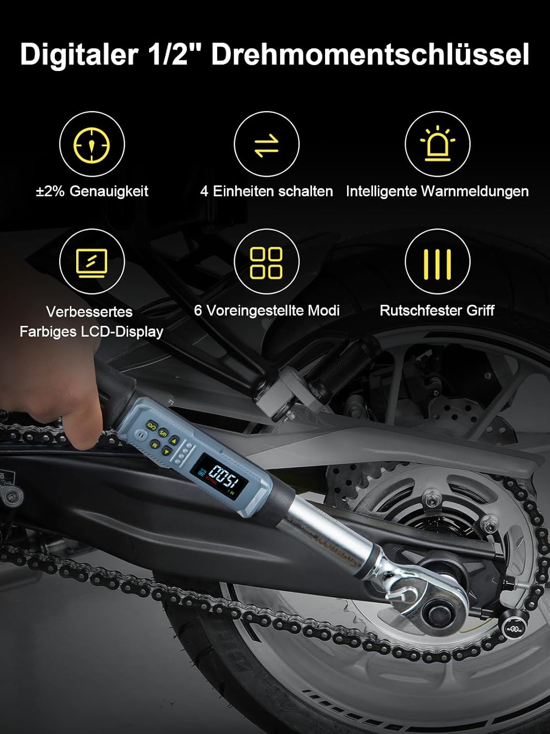 Cheia ușor de utilizat: Acest set de cuplu are un bâzâit și un indicator LED, sarcina noastră inteligentă de cuplu vă avertizează cu un sunet clar și indicatorul luminează bliț atunci când vă apropiați de cuplul prestabilit și ajungeți la acesta pentru a preveni subînchiria sau supra-înăsprirea. Mânerul antiderapant este proiectat ergonomic pentru a reduce oboseala mâinilor.