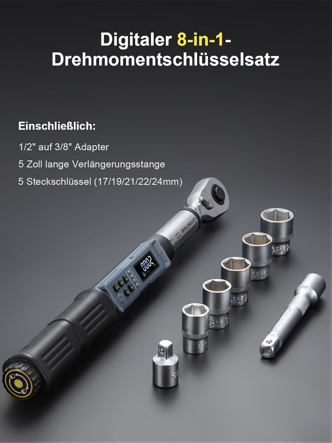 Asistență puternică pentru cuplu: Acest set de chei de cuplu conține câștig digital de cuplu x 1, inserții universale de stagii de parcare x 5 (17/19/21/22/2/2/2/2/2/2 mm), tijă de extensie de 5 inch x 1, 1⁄2 inch și adaptor de 3/8 inch, baterii AAA x 1, carcasă de depozitare x 1. Pregătit pentru orice lucrare, oricând
