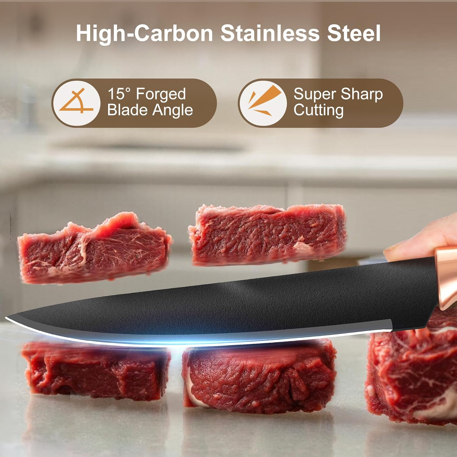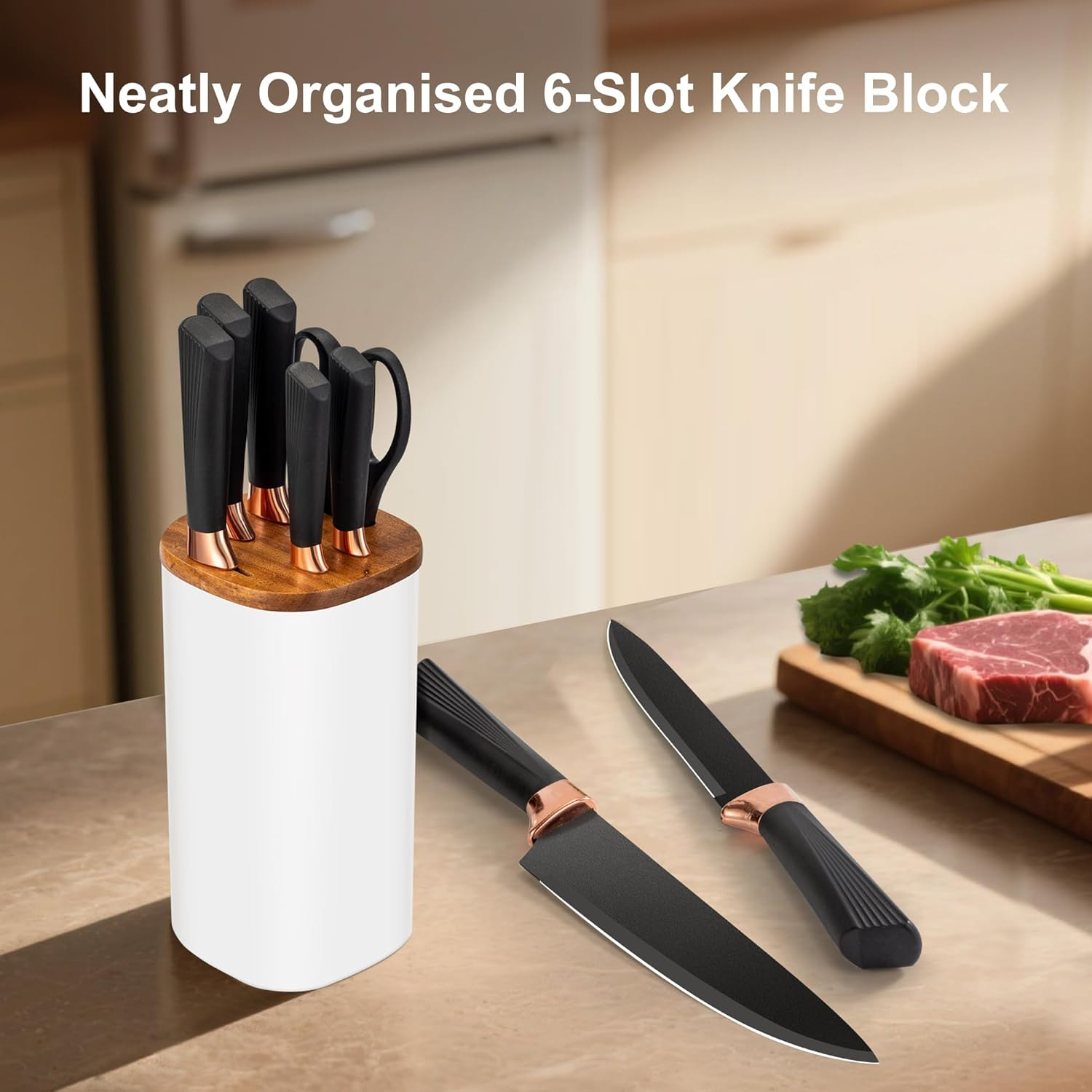 • Design greu-Greuat și stabil: Seturile de cuțit de bucătărie cu bloc are un fund armat, cu greutate adăugată pentru a preveni basculara, asigurând depozitarea sigură pentru setul de cuțite, foarfece și ustensile de bucătărie. Spre deosebire de suporturile magnetice slabe, designul nostru elimină riscurile de alunecare și evită zgârierea tejghelei