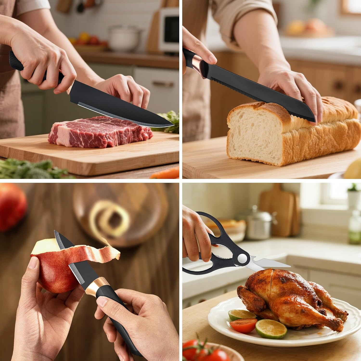 • Set practic de 6 piese cu cuțit cu bloc: Acest set de înaltă calitate conține cuțit de bucătărie de 32 cm, cuțit de bucătar de 34 cm, cuțit utilitar de 19 și 23 cm, foarfece de bucătărie de 23 cm și bloc de cuțit utilitar de 30 cm. Perfect pentru tăierea cărnii, a peștelui, a legumelor și a fructelor. Accesoriul elegant al bucătăriei vă oferă o experiență de gătit de primă clasă. Vă rugăm să rețineți că seturile noastre de cuțite metalice nu sunt sigure pentru mașina de spălat vase