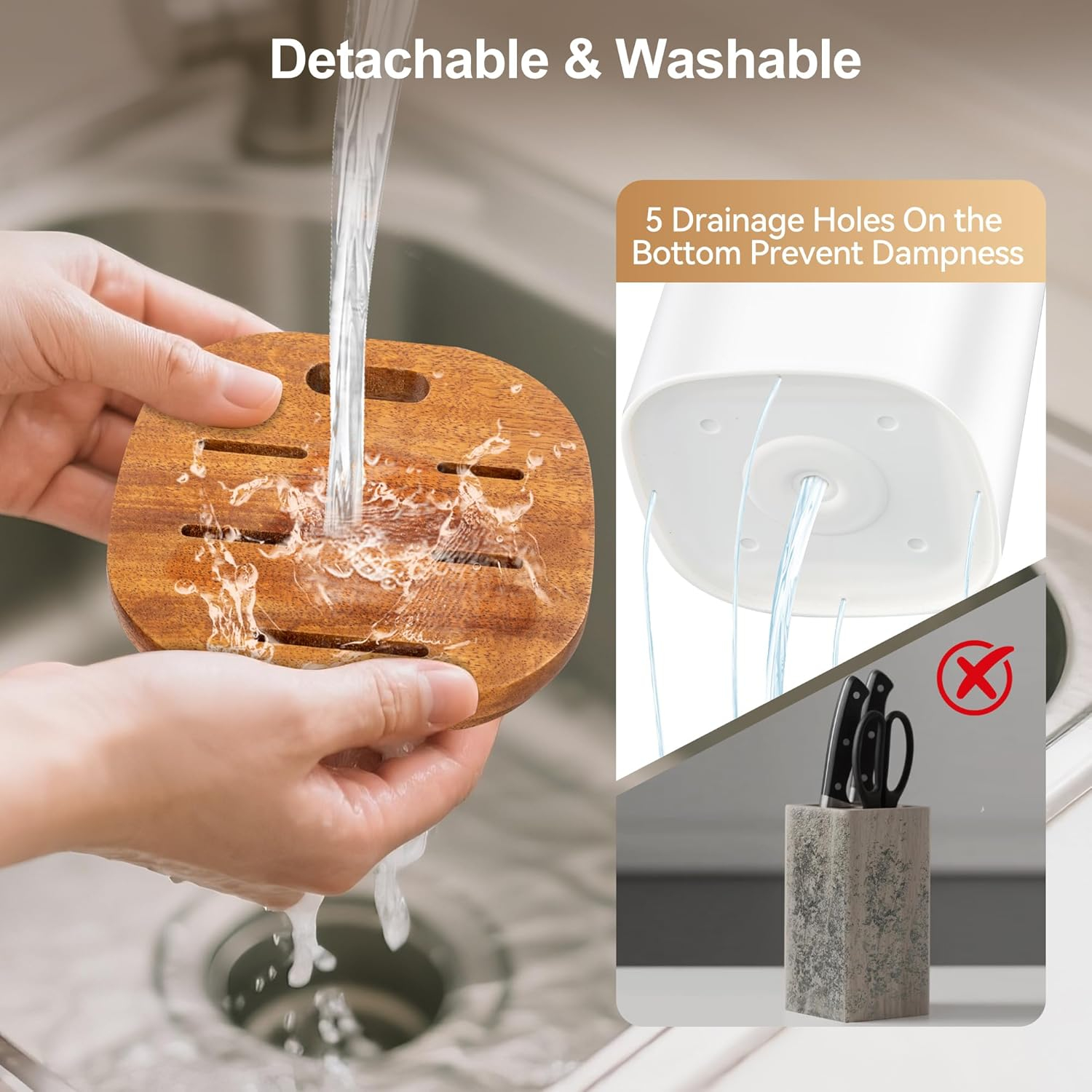 • Material premium: Combină o bază de plastic cu un capac elegant din lemn pentru un aspect modern. Spre deosebire de blocurile universale din toate lemnele, designul nostru detașabil cu găuri de drenaj, acesta poate fi spălat cu ușurință și se usucă rapid, ceea ce împiedică acumularea de umiditate și mucegaiul