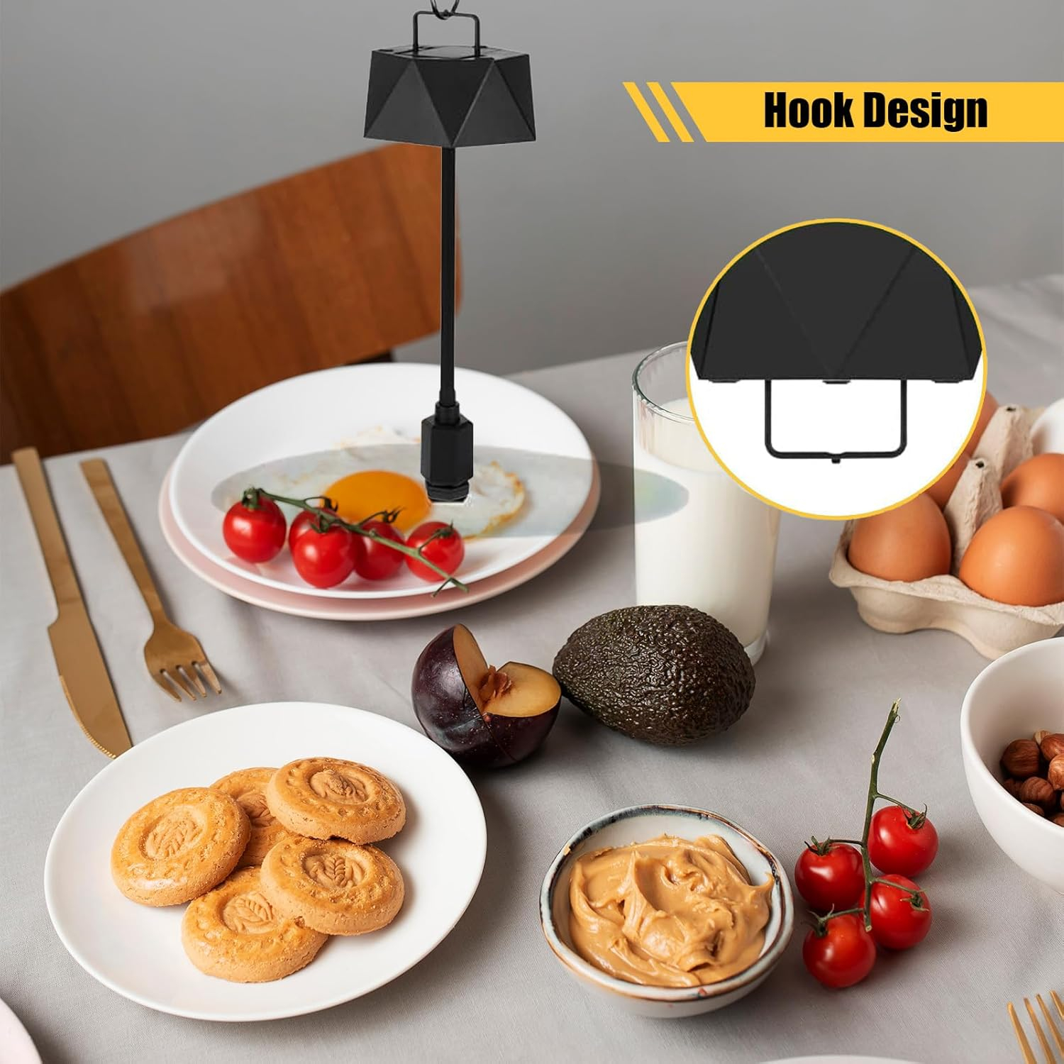 Suspensia flexibilă și reglarea locului: partea inferioară a produsului este bine echipată cu un dispozitiv practic agățat, astfel încât ventilatorul să poată fi ușor întoars cu susul în jos în corturi, gazebos, balustradele de balcon etc. să poată fi agățat, eliberând spațiu pe birou pentru diferite utilizări. Păstrați insectele enervante departe de mâncare și asigurați-vă că vă puteți bucura de timpul petrecut în aer liber cu familia și prietenii.