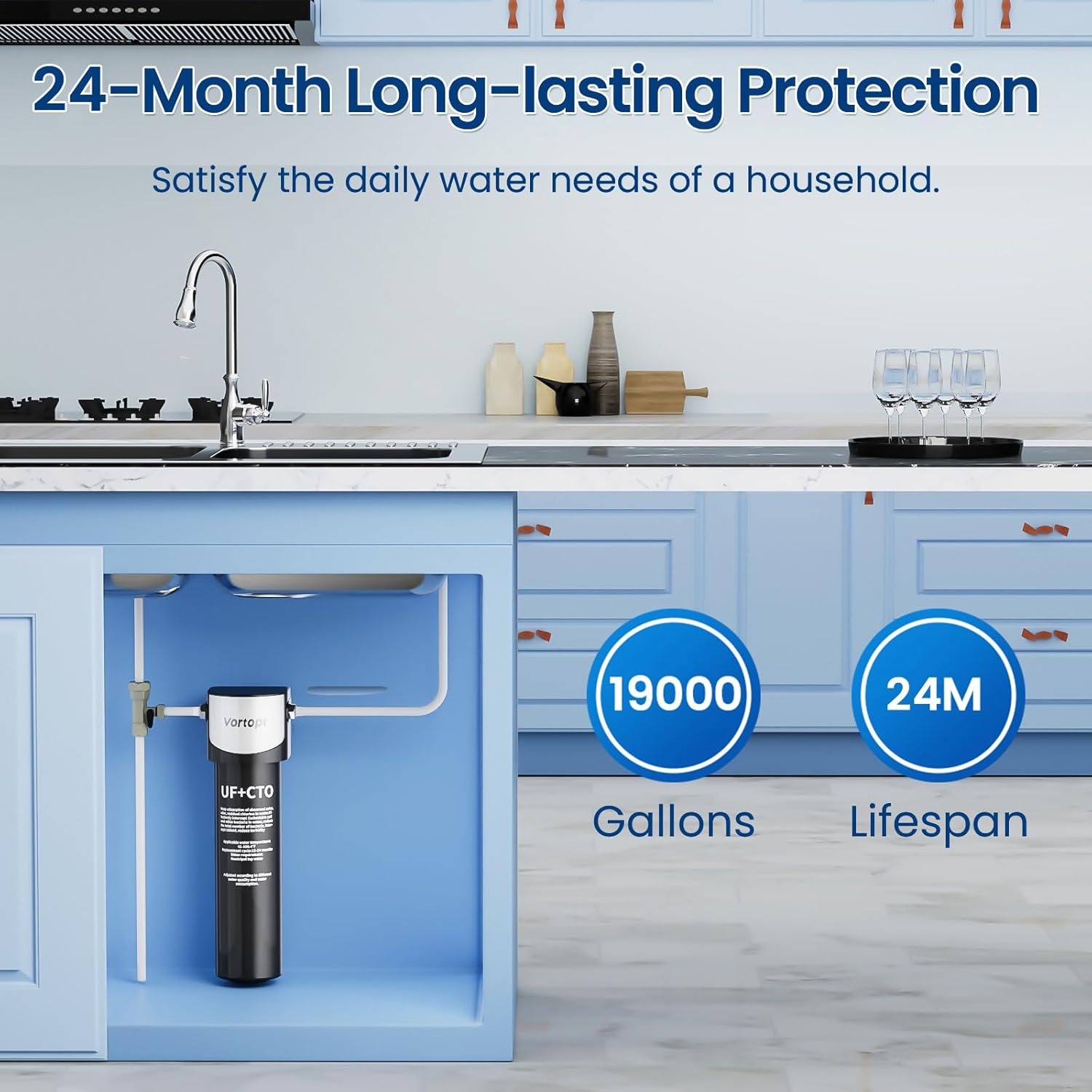 2 Years Long Lifespan: Cu o capacitate de super filtrare de 19.000 de galoane, sistemul de filtrare a apei sub chiuvetă asigură o sursă constantă de apă curată și sănătoasă pentru nevoile dumneavoastră zilnice. Durata de viață este de până la 24 de luni, ceea ce poate oferi protecție pe termen lung pentru familia ta.