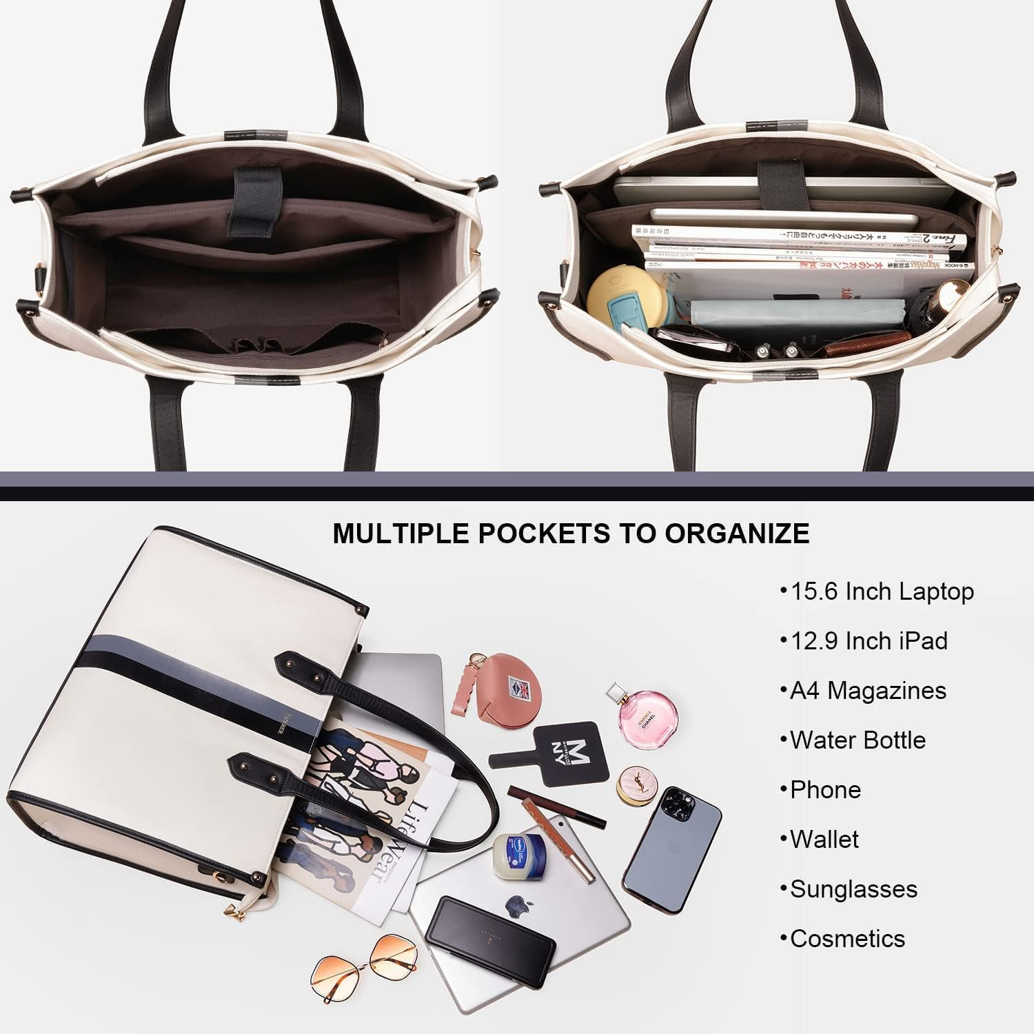 Divizia practică: Această geantă de lucru pentru femei este echipată cu 1 x compartiment principal, fermoar la deschiderea superioară pentru siguranță; 2 x compartimente căptușite, unul pentru laptop de 15,6 inch, celălalt pentru iPad de 12,9 inch; 1 x buzunar cu fermoar pentru portofel, telefon mobil; 2 x compartimente de stilou; 2 x buzunare deschise; 1 x curea elastică pentru sticlă de apă. Mai multe buzunare vă mențin toate lucrurile bine organizate și ușor accesibile.