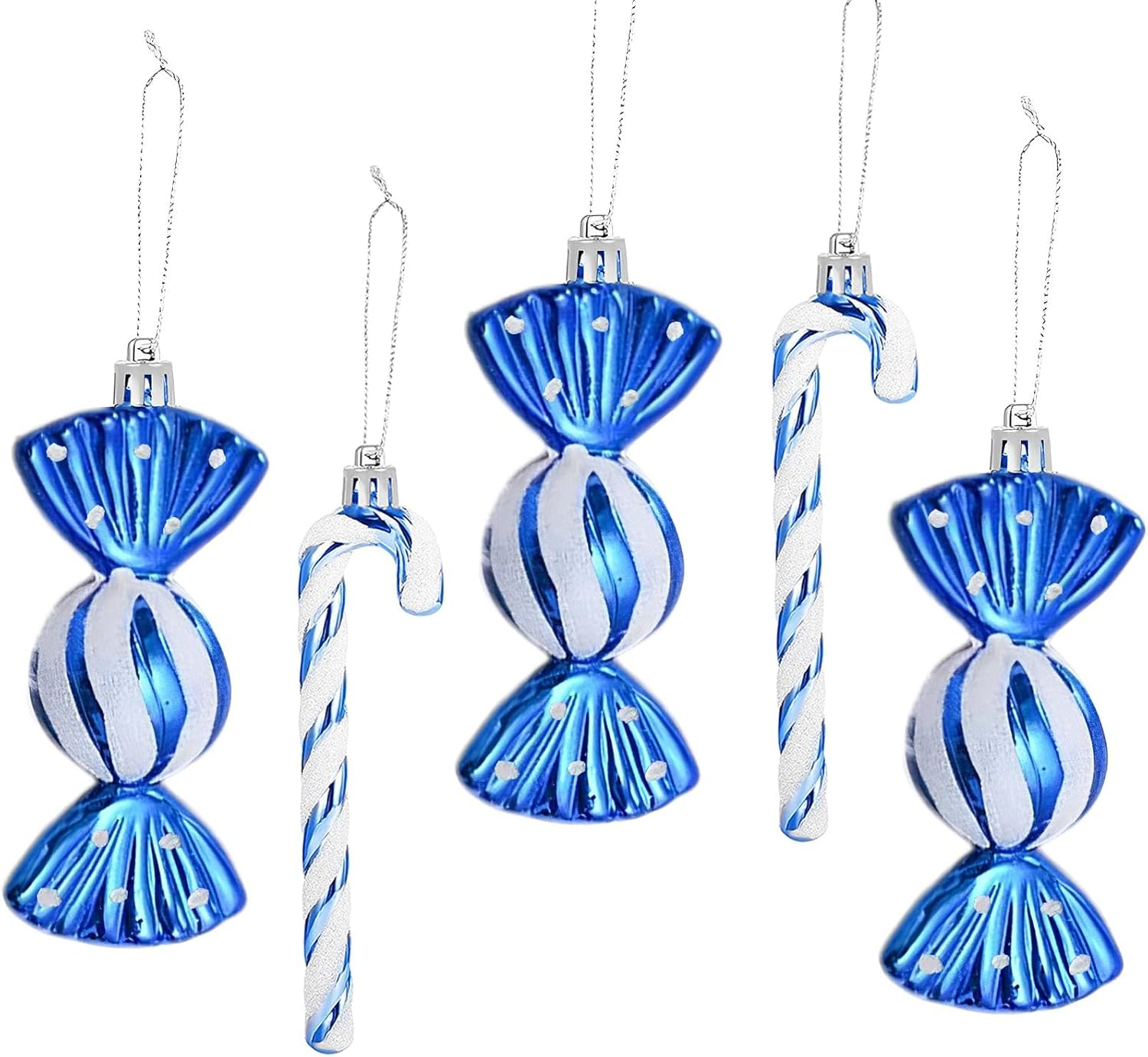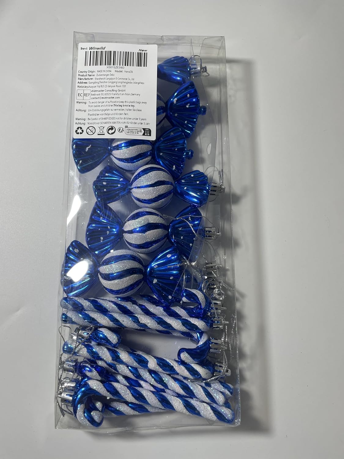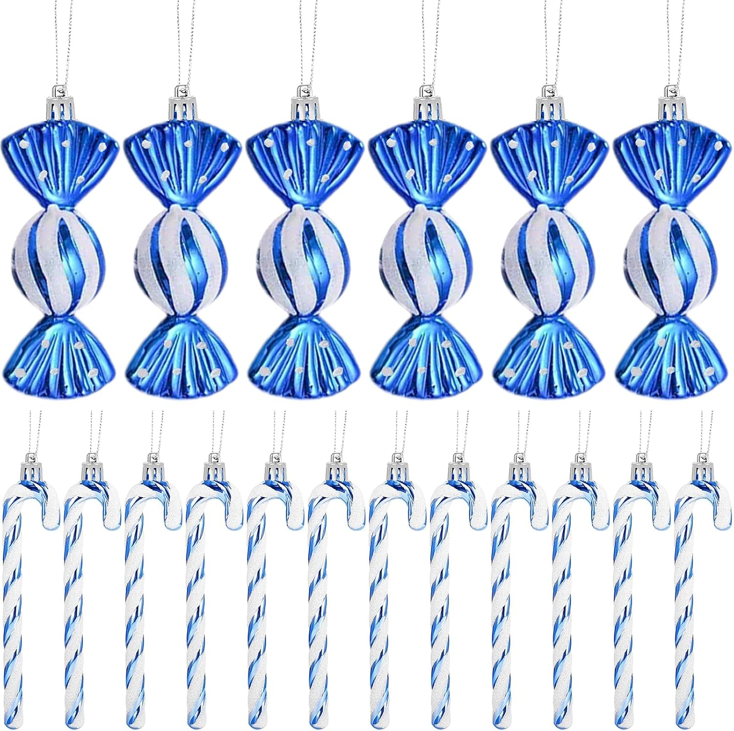 Decorarea bradului de Crăciun set albastru – include 6 bauble de Crăciun de până la 12 cm, 12 decorațiuni din trestie de bomboane de până la 14 cm. Îndulciți-vă Crăciunul cu aceste bomboane basculante de brad de Crăciun