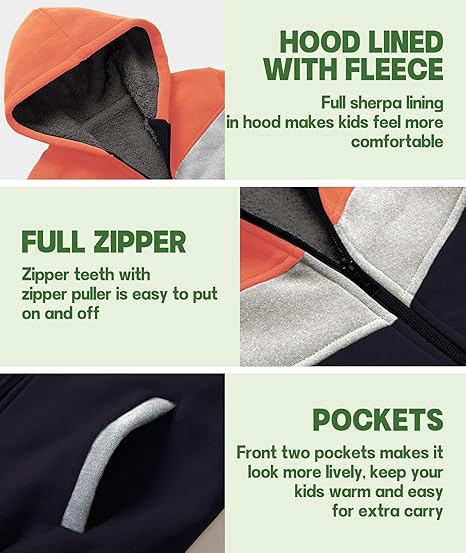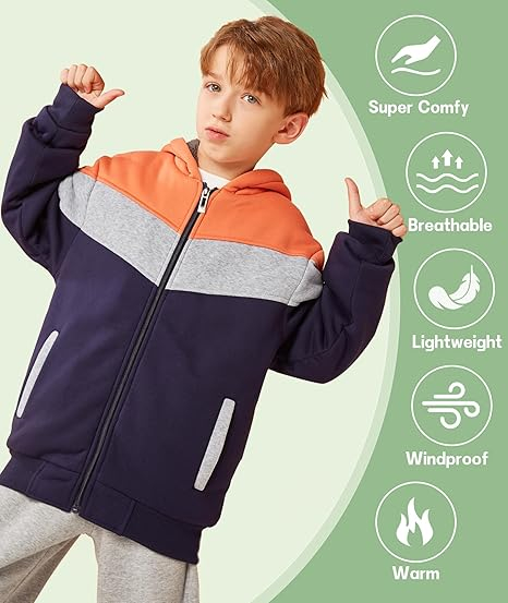 Bluza cu fermoar si cu glugă, două buzunare adânci, manșete elastice cu nervuri și bandă tiv, fermoar închis, ușor de pus și scos. Jachetă de trening de iesiri in aer liber pentru copii, pentru a proteja copiii de vântul rece și pentru a-i menține calzi.