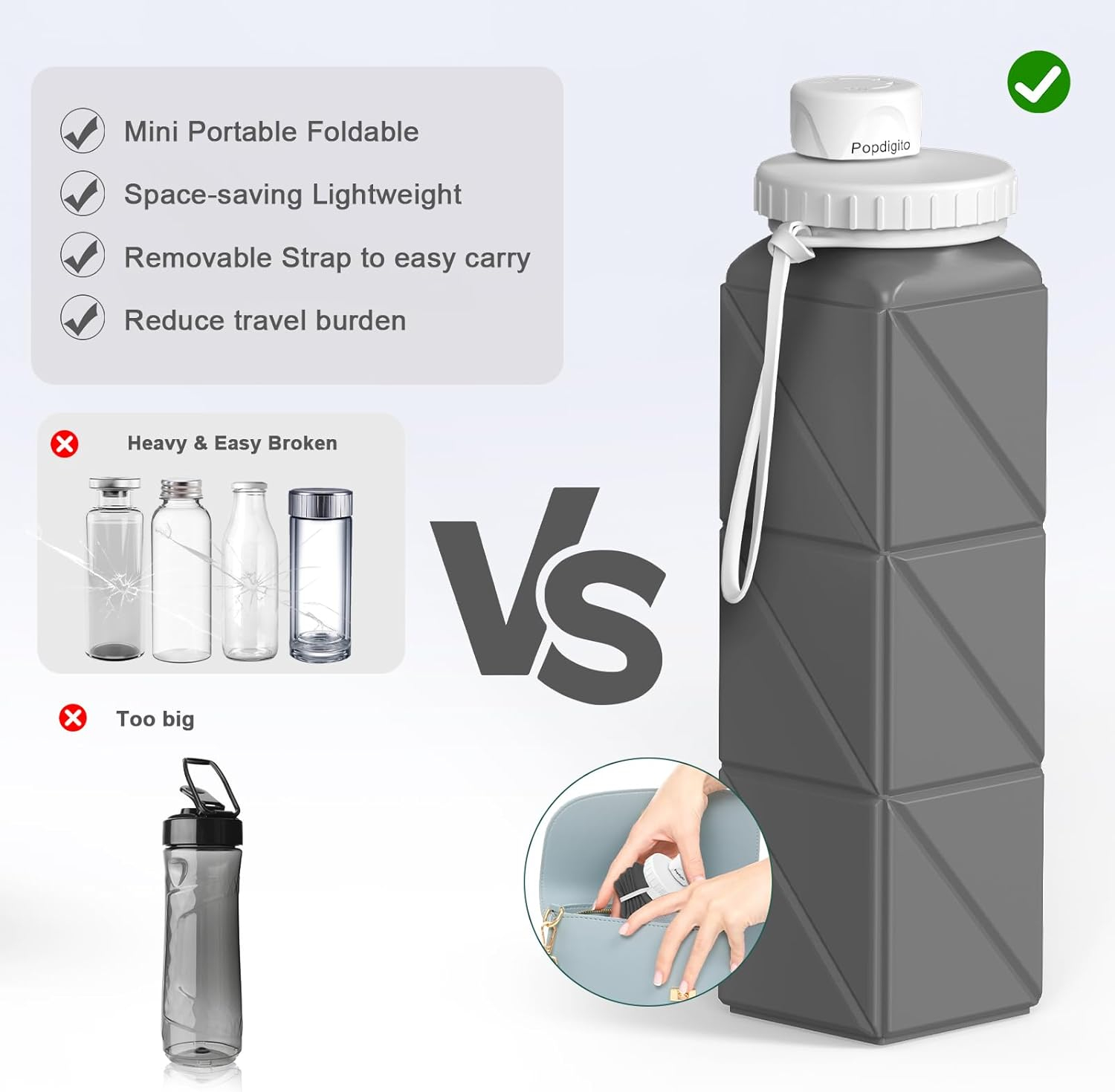 • Această sticlă de apă pliabilă de 20,6 fl oz (610 ml) se extinde cu ușurință atunci când este utilizat și se pliază la o dimensiune compactă atunci când nu este necesar - perfect pentru a vă ascunde în geantă sau rucsac. Indiferent dacă faceți drumeții, camping, ciclism, alergare, alpinism, călătoriți, faceți naveta sau vă îndreptați spre sala de gimnastică, BEAUTAIL vă menține hidratat fără vrac.
