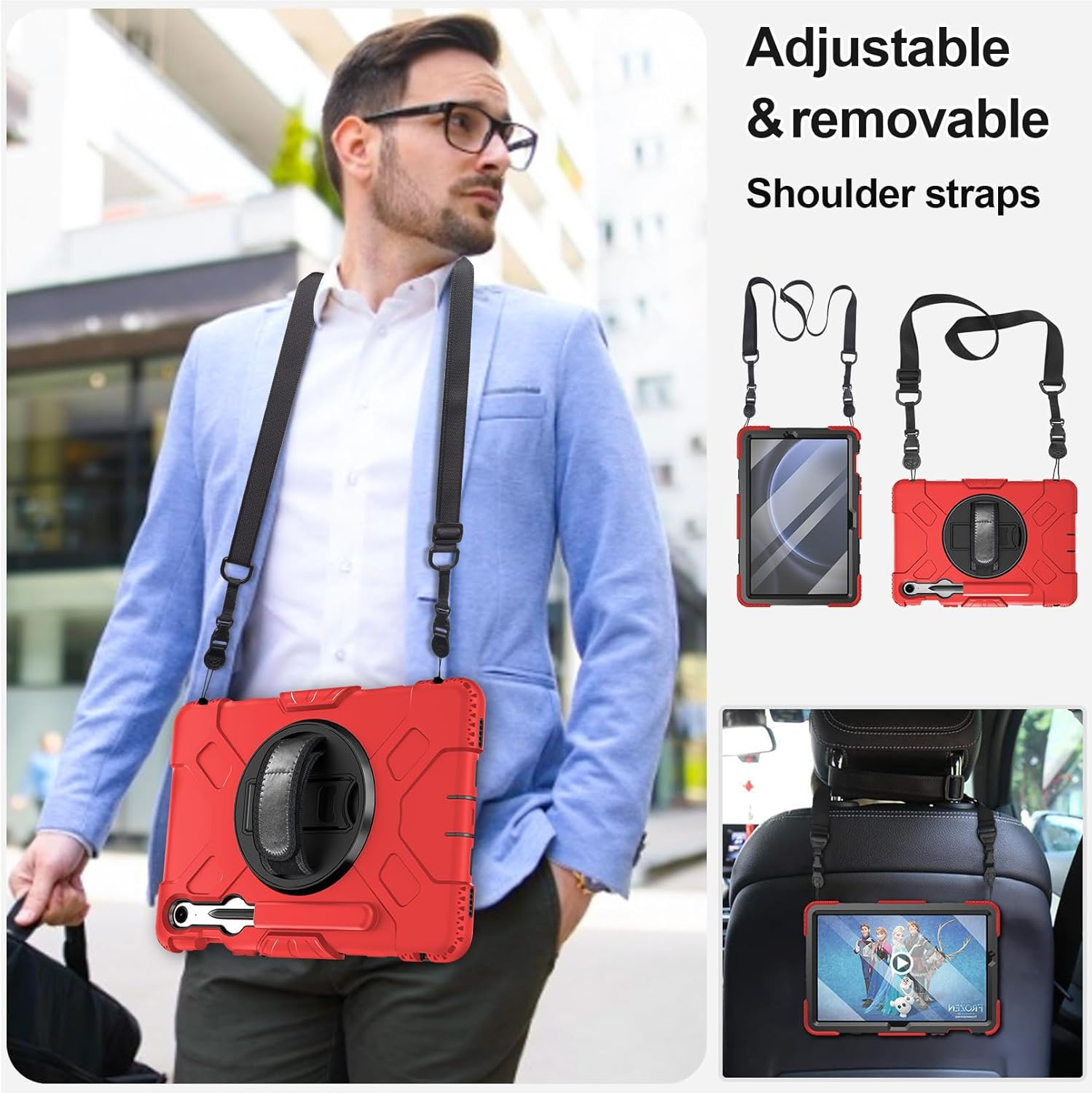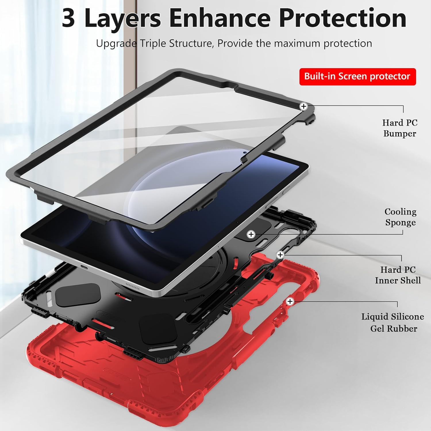 Husă socuri Samsung Galaxy Tab S9 FE 11.9 2023, calitate militară, cu 3 straturi, cu protecție pentru ecran, suport pentru stilou S, suport rotativ, rosu