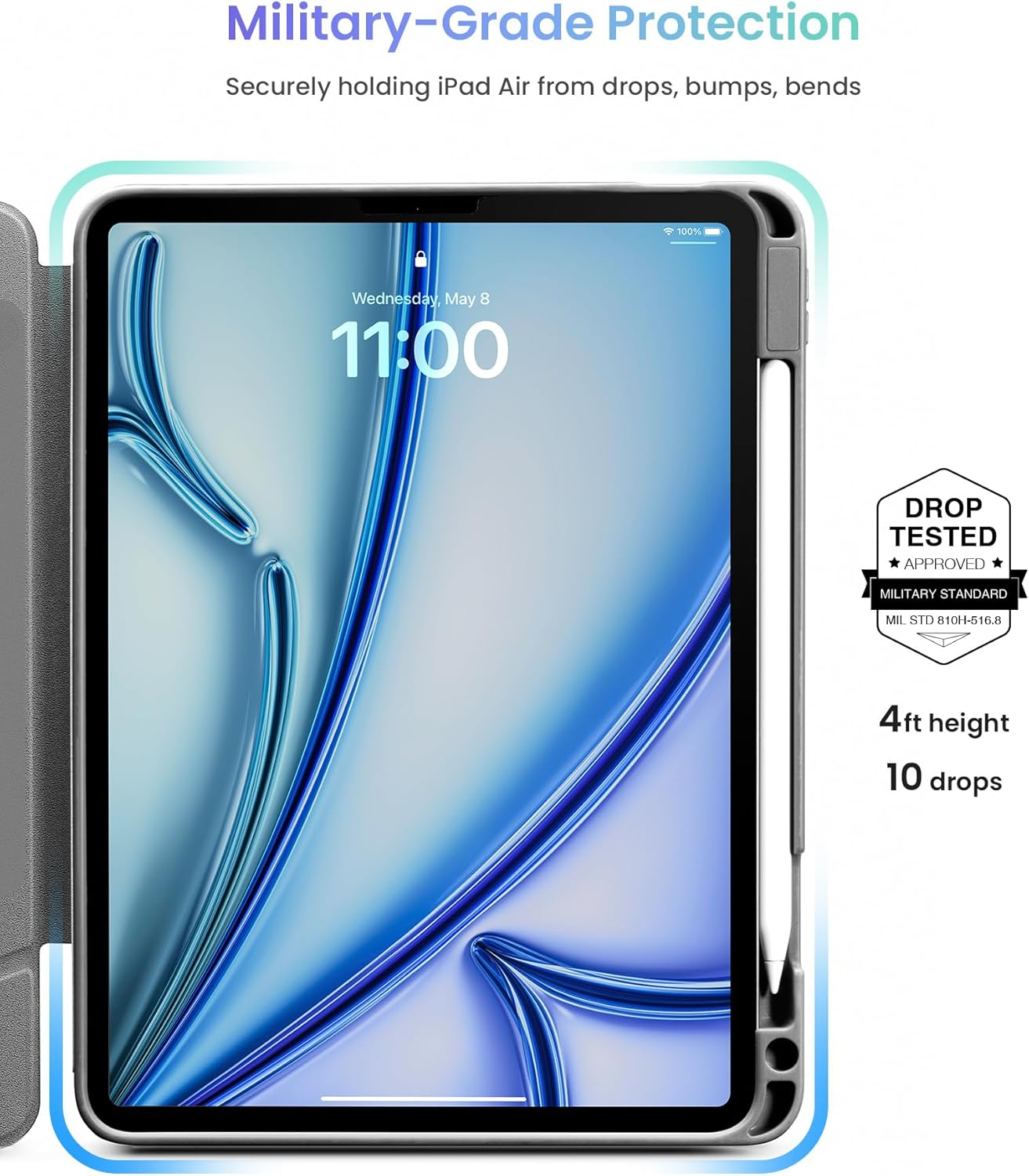 • Protecție completă: Carcasa iPad Air a trecut testul standard standard de blocare a standardului STD-810H, învelișul său TPU a fost testat pentru a vă asigura că noul iPad este protejat de toate picăturile de până la 4 picioare