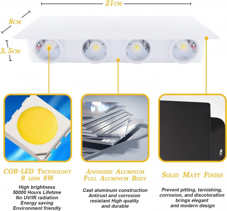 ✔ Detalii tehnice: autonomia rețelei: 100 V – 240 V, culoare deschisă: alb cald (3050-3250 K); 600-720 lumeni; material principal: aluminiu de înaltă calitate, rezistent la oxidare; priză: LED-uri COB încorporate (nu pot fit înlocuibile); durată de viață de serviciu: aprox. 50.000 de ore. Dimensiuni: 22 cm (lățime) x 9 cm (înălțime) x 5 cm (proiectare), dimensiune mică, economisire a spațiulu