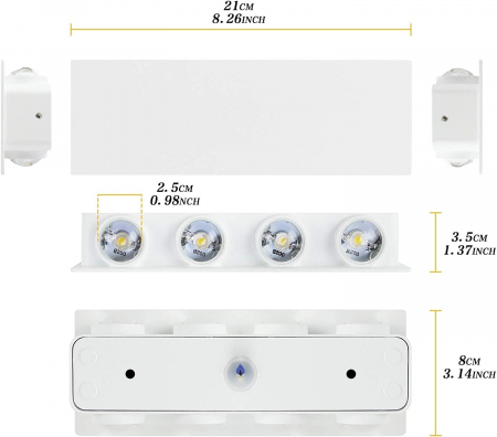 ✔ Efectele de lumină în sus și în jos: în sus și în jos, 4 LED-uri emit conicul lor alb cald în formă de con, care se răspândește ușor pe perete. Acest lucru duce la o atmosferă foarte plăcută. În scara, dormitorul, camera de zi, bucătăria sau pe hol, lumina de perete metalică cu opt bec este foarte bună