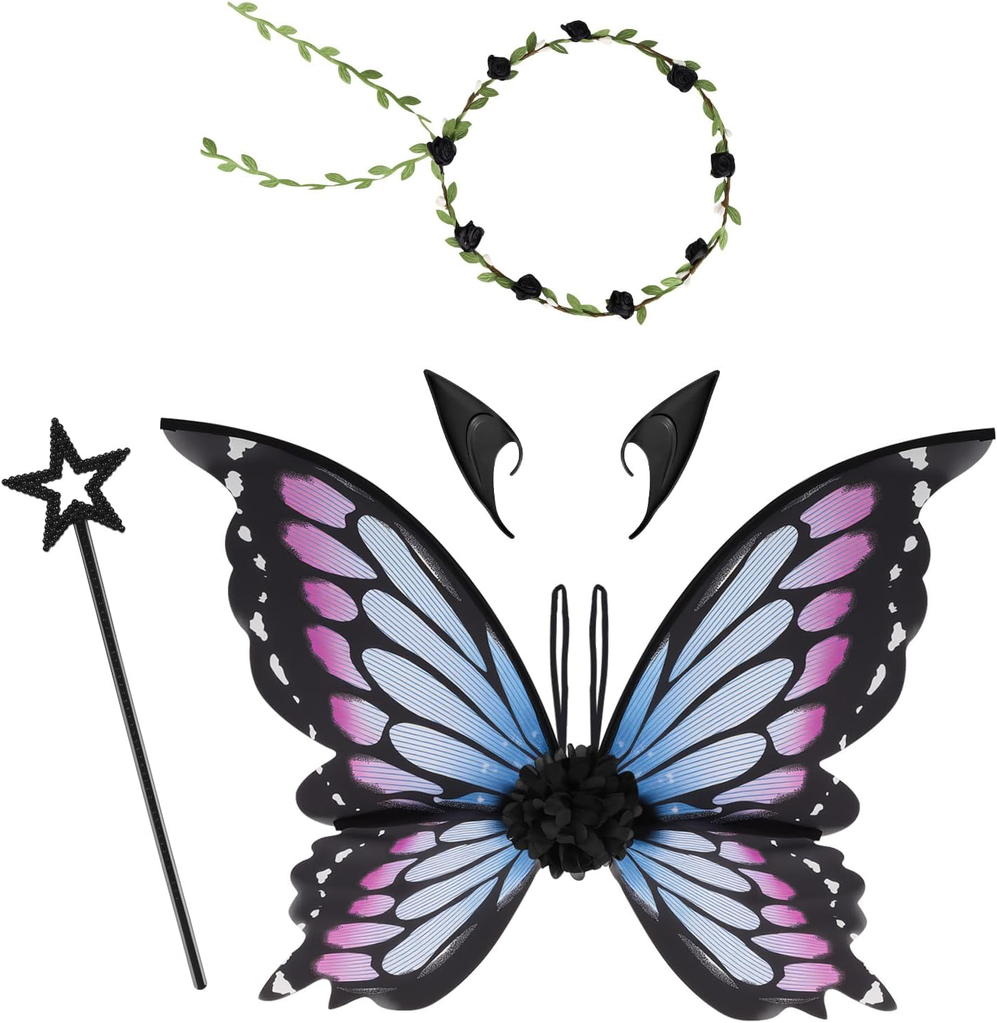Set full set: aripile noastre de zână pentru copii conțin 1 set de aripi frumoase de zână copii, 1 panglică delicată de flori, 2 urechi magice de elf și o baghetă magică.