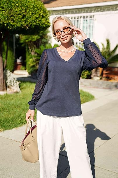 Caracteristici: V-gât, mânecă lungă, casual, simplu, elegant, bleumarin, mânecă pufoasă. Bluza clasică pentru femei are un design elegant în formă de V, care arată în mod clar liniile fermecătoare ale gâtului. Stilul lejer, manecile frumoase transparente fac ca brazii sa arate mai subtire. Designul polka dot de pe mâneci oferă ținutelor tale de toamnă și de iarnă un punct culminant.