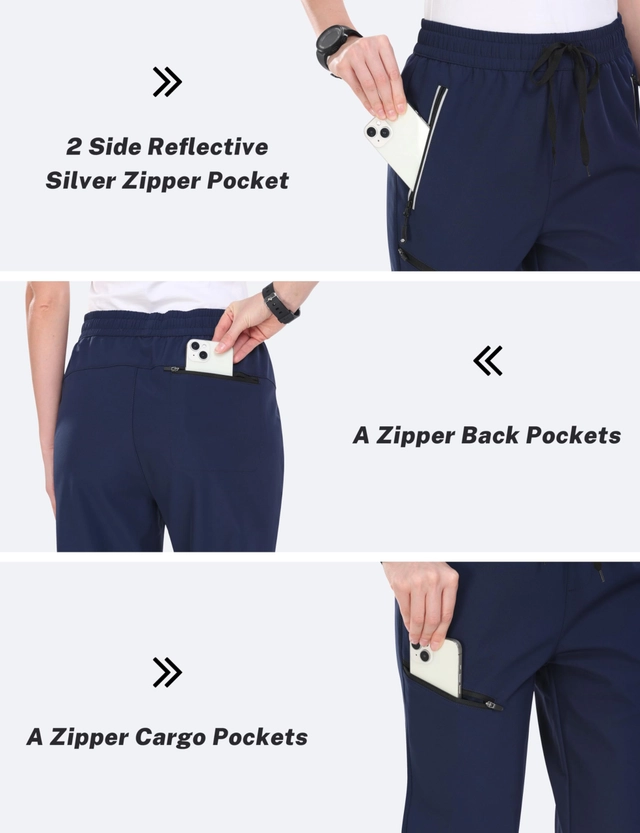 Detalii: pantaloni moi pentru femei, talie reglabilă de șnur, două buzunare reflectorizante laterale cu fermoar, 1 fermoar pe coapsă.