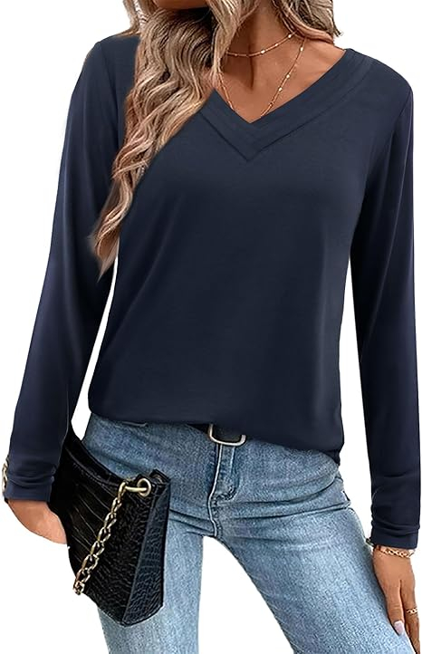 Tricou de vară pentru femei, cu maneca lunga, decolteu V Albastru L