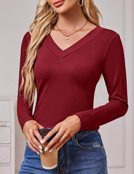 Tricou de vară pentru femei, cu maneca lunga, decolteu V Rosu L