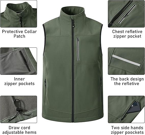 4 buzunare cu fermoar și 4 buzunare interioare adânci, convenabile pentru telefoane mobile, chei și alte elemente. Designul complet al vestei bărbătești o face ușor de pus și decolat.
